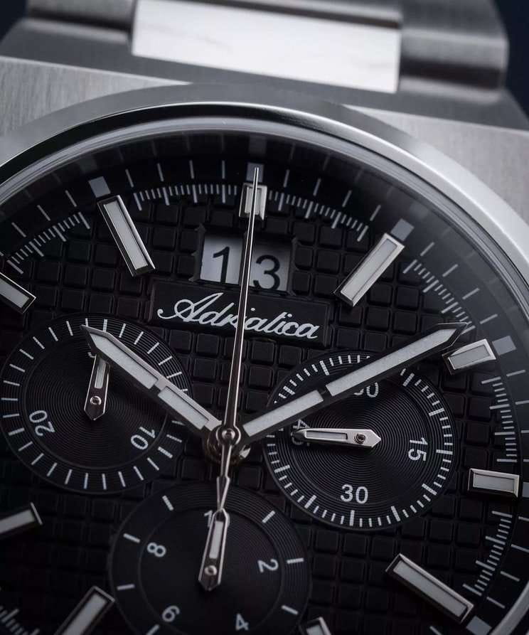 Мужские швейцарские часы-хронографХронографФункция позволяет измерять отрезки времени с особой точностью: часы, минуты, секунды. Верным признаком хронографа является наличие на циферблате 3 дополнительных окошек-счётчиков. с секундомеромСекундомерСекундоме́р — прибор, способный измерять интервалы времени с точностью до долей секунды. Adriatica Premiere A8326.5114CH воплощают в себе элегантность и функциональность, идеально подходящие для современных мужчин, ценящих швейцарское качество. Их черный циферблат защищенный сапфировым стекломСапфировое стеклоПрочный и надёжный материал из кристалла сапфира синтетического происхождения, характеризующийся особой твёрдостью и устойчивостью к царапинам и повреждениям., заключен в корпус из нержавеющей стали диаметром 40 мм и толщиной 10 мм. Надежный кварцевый механизм с калибром Ronda 5040.B обеспечивает высокую точность, а водозащита 5 ATM делает часы устойчивыми к воздействию воды. Стальной браслет с раскладной застёжкойРаскладная застёжкаТакой тип застёжки используется только на браслетах из металла. Она никогда не раскрывается полностью, происходит разделение на 2 и более частей. Раскладывающая застёжка снизит вероятность потери часов к минимуму. обеспечивает комфортное и надежное ношение. Фактурный циферблат с метками в виде штрихов дополнен рисунком в клетку, а окошко даты находится в положении 12 часов, что добавляет практичности в повседневной жизни. Люминесцентное покрытиеЛюминесцентное покрытиеПозволяет считывать показания времени в темноте. Производители наносят на стрелки, часовые индексы, безель или поверхность циферблата светонакопительный состав, дающий холодное свечение. на стрелках и метках обеспечивает отличную видимость в темноте.