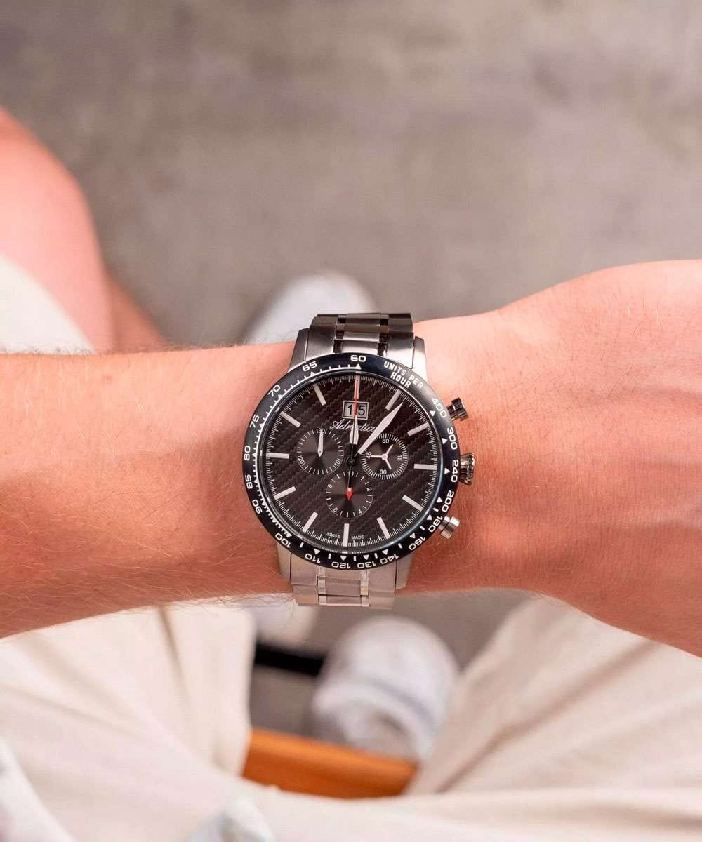 Мужские швейцарские часы-хронографХронографФункция позволяет измерять отрезки времени с особой точностью: часы, минуты, секунды. Верным признаком хронографа является наличие на циферблате 3 дополнительных окошек-счётчиков. с секундомеромСекундомерСекундоме́р — прибор, способный измерять интервалы времени с точностью до долей секунды. и тахиметромТахиметрРазмеченная шкала, располагается на ободке или безеле часов. Тахиметр позволяет рассчитать скорость на определённом участке пути, расстояние измеряется в километрах или милях. Adriatica Aviation A8383.4116CH воплощают в себе элегантность и функциональность, их выбирают целеустремленные мужчины, которые знают цену времени. Темно-серый циферблат часов, защищенный сапфировым стекломСапфировое стеклоПрочный и надёжный материал из кристалла сапфира синтетического происхождения, характеризующийся особой твёрдостью и устойчивостью к царапинам и повреждениям., заключен в корпус из титана диаметром 46 мм и толщиной 12 мм. Надежный кварцевый механизм с калибром Ronda 5040.B обеспечивает высокую точность, а водозащита 5 ATM делает часы устойчивыми к воздействию воды. Стальной браслет с раскладной застёжкойРаскладная застёжкаТакой тип застёжки используется только на браслетах из металла. Она никогда не раскрывается полностью, происходит разделение на 2 и более частей. Раскладывающая застёжка снизит вероятность потери часов к минимуму. обеспечивает комфортное и надежное ношение. Циферблат с метками в виде штрихов имеет 3 дополнительных циферблата, а также окошко даты в положении «12» , что добавляет практичности в повседневной жизни. Люминесцентное покрытиеЛюминесцентное покрытиеПозволяет считывать показания времени в темноте. Производители наносят на стрелки, часовые индексы, безель или поверхность циферблата светонакопительный состав, дающий холодное свечение. на стрелках и метках обеспечивает отличную видимость в темноте.