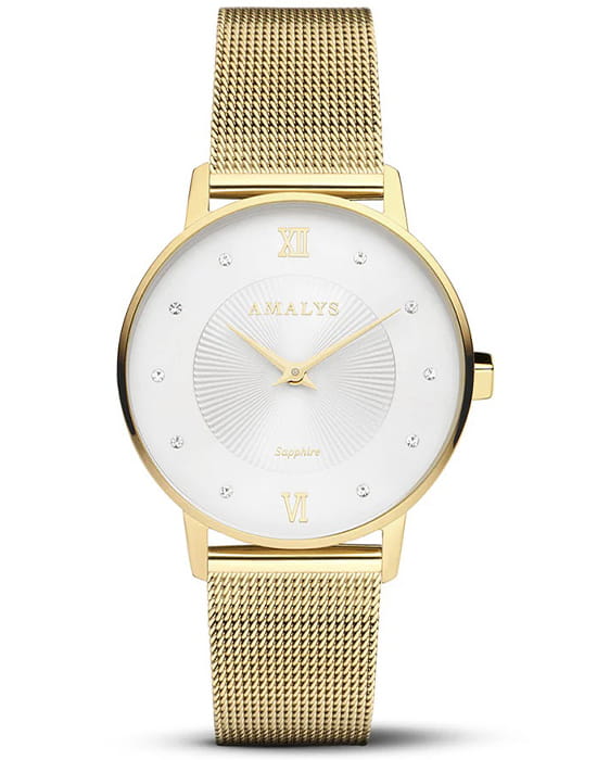 Amalys AMW-178 — женская модель с утончённым классическим дизайном, в которой сочетаются элегантность и практичность. Круглый корпус диаметром 33 мм выполнен из нержавеющей стали с PVD-покрытиемPVDУльтратонкое покрытие наносится в технике вакуумного напыления, сочетает в себе нитрид титана особой прочности со слоем золота или оксида хрома. Несёт в себе декоративную или защитную функцию., гармонирующим с браслетом шириной 16 мм в том же исполнении. Защитную функцию выполняет сапфировое стеклоСапфировое стеклоПрочный и надёжный материал из кристалла сапфира синтетического происхождения, характеризующийся особой твёрдостью и устойчивостью к царапинам и повреждениям., стойкое к царапинам и сохраняющее прозрачность. Механизм — кварцевый, обеспечивающий точность и стабильность хода. Браслет миланского плетения с PVD-покрытиемPVDУльтратонкое покрытие наносится в технике вакуумного напыления, сочетает в себе нитрид титана особой прочности со слоем золота или оксида хрома. Несёт в себе декоративную или защитную функцию. снабжён раскладным замкомРаскладной замокДанный вариант застежки используется только на часах с металлическим браслетом. Отличительная особенность такого крепления в том, что длина браслета становится универсальной и вы можете самостоятельно отрегулировать нужный вам размер – застежка просто двигается по браслету часов., который сочетает надёжность фиксации и удобство повседневного использования. Водозащита 3 ATM защищает часы от случайных брызг и дождя. Циферблат с римскими индексами и изящными стрелками подчёркивает классическую эстетику модели, делая её уместной как в повседневных образах, так и в торжественной обстановке.