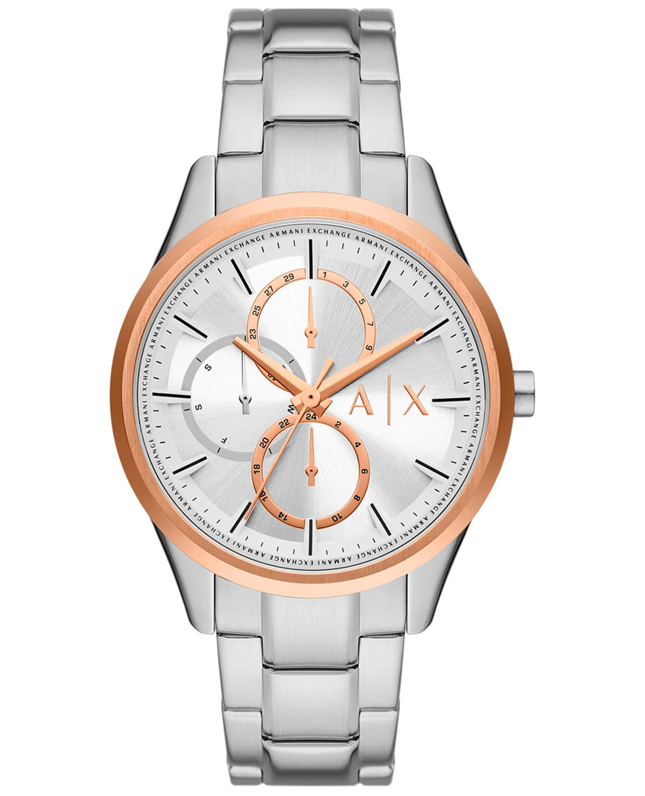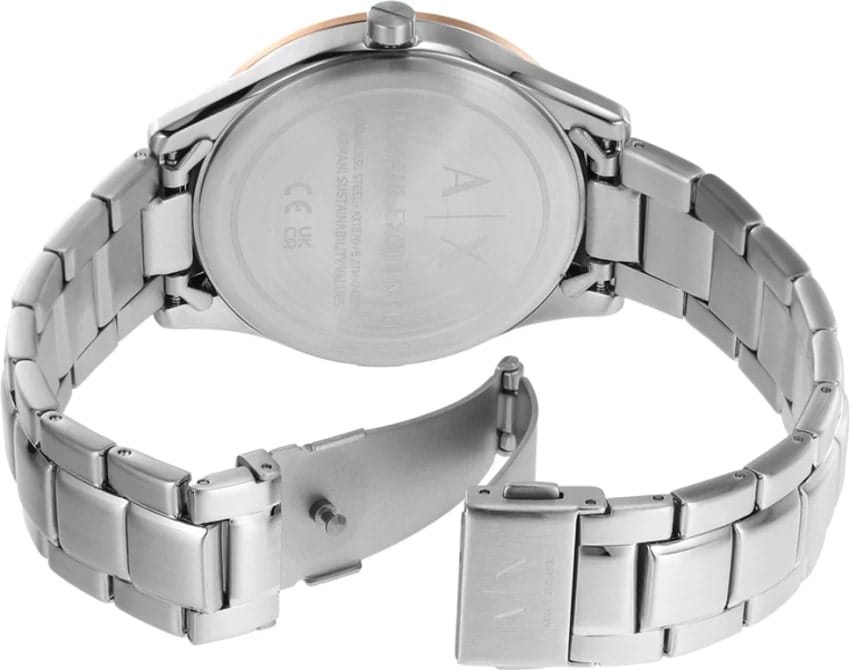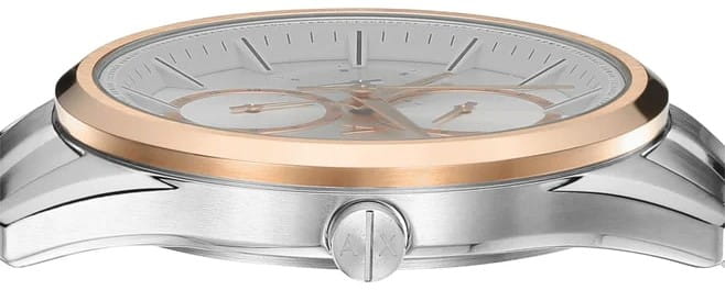 Мужские наручные часы с минеральным стекломМинеральное стеклоМинеральное стекло представляет собой искусственно выращенный минерал кварца. Такое стекло отличается особой устойчивостью к повреждениям и царапинам. Уступает по некоторым качествам сапфировому стеклу. Armani Exchange Dante AX1870, кварцевый механизм с высокой точностью. Класс водозащиты: 50 метров, позволит защитить корпус от случайных брызг или капель дождя. Корпус часов изготовлен из стали. Стальной браслет на раскладной застёжкеРаскладная застёжкаТакой тип застёжки используется только на браслетах из металла. Она никогда не раскрывается полностью, происходит разделение на 2 и более частей. Раскладывающая застёжка снизит вероятность потери часов к минимуму.. БезельБезельВнешний ободок, закрепляющий стекло. В спортивных часах так называется поворотное кольцо с делениями на циферблате, выполняет роль таймера – замеряет отрезки времени на шкале. Неподвижный безель – элемент декора. Однонаправленно вращающийся безель на дайверских часах позволяет фиксировать моменты погружения и выныривания на поверхность. с IP-покрытиемIP-покрытиеМетод ионного напыления. Демонстрирует повышенную устойчивость к истиранию, окислению и химическим веществам. Под воздействием высокого давления и температуры около 1500°C молекулы металла надёжно соединяются с частицами корпуса часов..