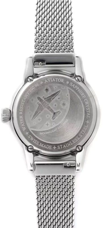 Aviator V.1.33.0.255.5 “Douglas Moonflight” — элегантный дамский швейцарский Moonphase с утончённой авиационной эстетикой. Корпус 36 мм из нержавеющей стали с полированной отделкой обладает компактными пропорциями и удобным литым профилем.