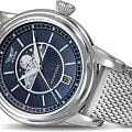 Циферблат в стиле Art Deco украшает усложнение фаз Луны в верхней половине, обрамлённой тонким кольцом облаков. Отмечено окно даты в положении «6 часов». Стрелки и накладные метки обработаны люминесцентным покрытиемЛюминесцентное покрытиеПозволяет считывать показания времени в темноте. Производители наносят на стрелки, часовые индексы, безель или поверхность циферблата светонакопительный состав, дающий холодное свечение. Superluminova — для уверенного считывания в темноте. Поверхность защищена сапфировым стекломСапфировое стеклоПрочный и надёжный материал из кристалла сапфира синтетического происхождения, характеризующийся особой твёрдостью и устойчивостью к царапинам и повреждениям. с антибликовым покрытием.