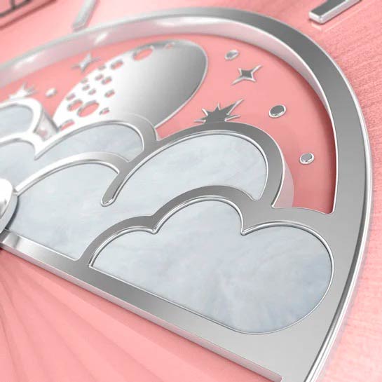 Циферблат в стиле Art Deco украшает усложнение фаз Луны в верхней половине, обрамлённой тонким кольцом облаков. Отмечено окно даты в положении «6 часов». Стрелки и накладные метки обработаны люминесцентным покрытиемЛюминесцентное покрытиеПозволяет считывать показания времени в темноте. Производители наносят на стрелки, часовые индексы, безель или поверхность циферблата светонакопительный состав, дающий холодное свечение. Superluminova — для уверенного считывания в темноте. Поверхность защищена сапфировым стекломСапфировое стеклоПрочный и надёжный материал из кристалла сапфира синтетического происхождения, характеризующийся особой твёрдостью и устойчивостью к царапинам и повреждениям. с антибликовым покрытием.