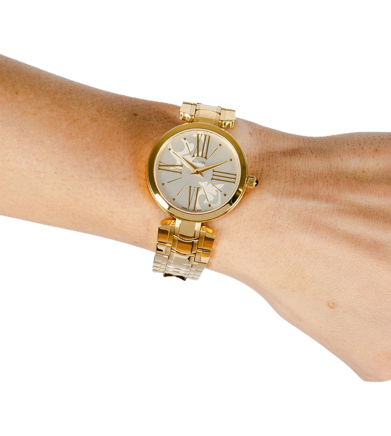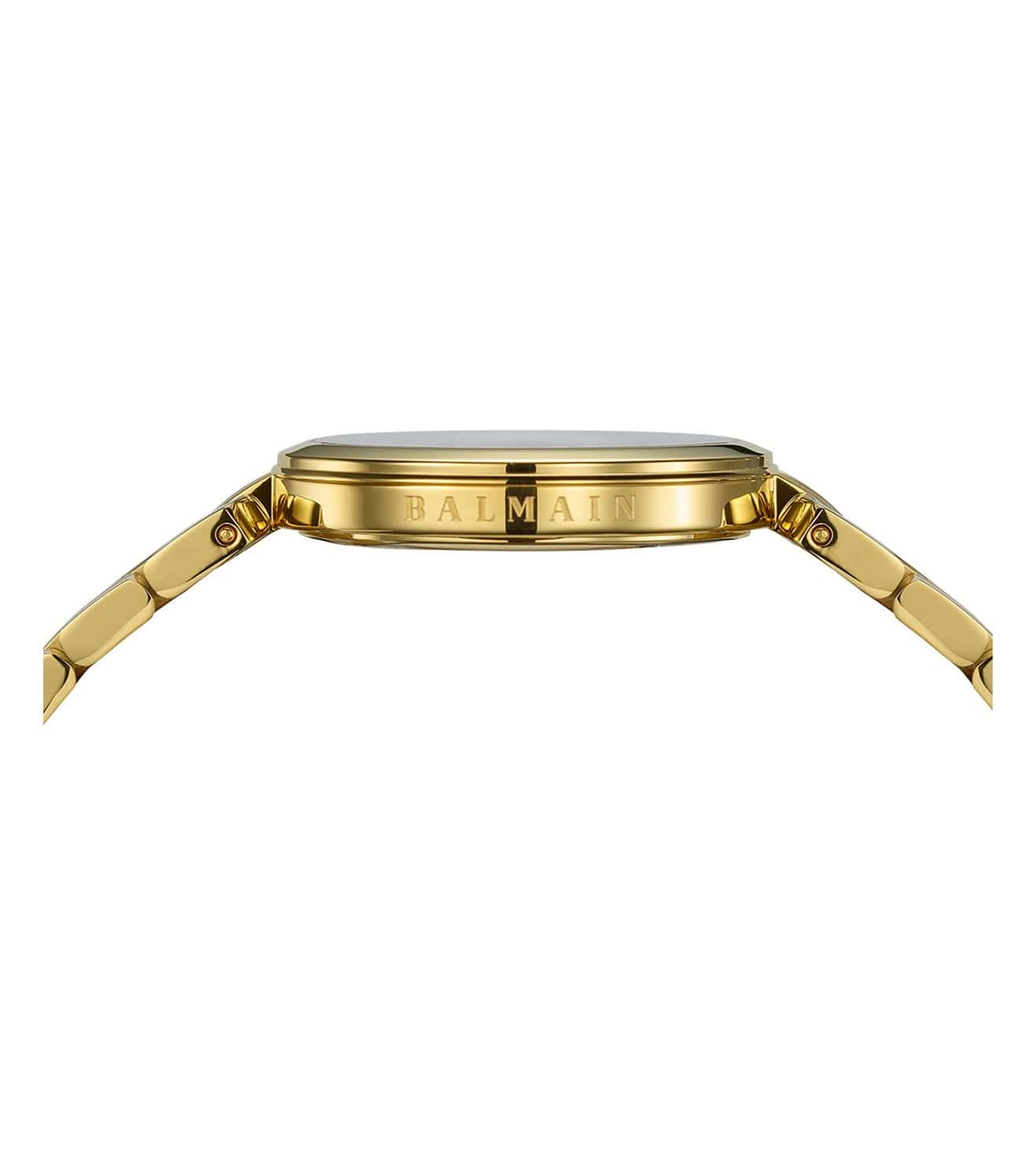 Женские часы Balmain Madrigal Lady III B4270.33.12 кварцевый механизм с высокой точностью. Сапфировое стеклоСапфировое стеклоПрочный и надёжный материал из кристалла сапфира синтетического происхождения, характеризующийся особой твёрдостью и устойчивостью к царапинам и повреждениям. устойчивое к появлению царапин, обладающее высокой прозрачностью. Корпус изготовлен из нержавеющей стали PVD-покрытиемPVDУльтратонкое покрытие наносится в технике вакуумного напыления, сочетает в себе нитрид титана особой прочности со слоем золота или оксида хрома. Несёт в себе декоративную или защитную функцию.. Класс водозащиты: 50 метров, позволит защитить корпус от случайных брызг или капель дождя. Стальной браслет с PVD-покрытиемPVDУльтратонкое покрытие наносится в технике вакуумного напыления, сочетает в себе нитрид титана особой прочности со слоем золота или оксида хрома. Несёт в себе декоративную или защитную функцию. на застёжке «бабочка» с кнопкамиЗастёжка "бабочка"Такой вид застёжки дополняется предохранителями, помогающими избежать случайного раскрытия браслета. Обладают изящным исполнением. .