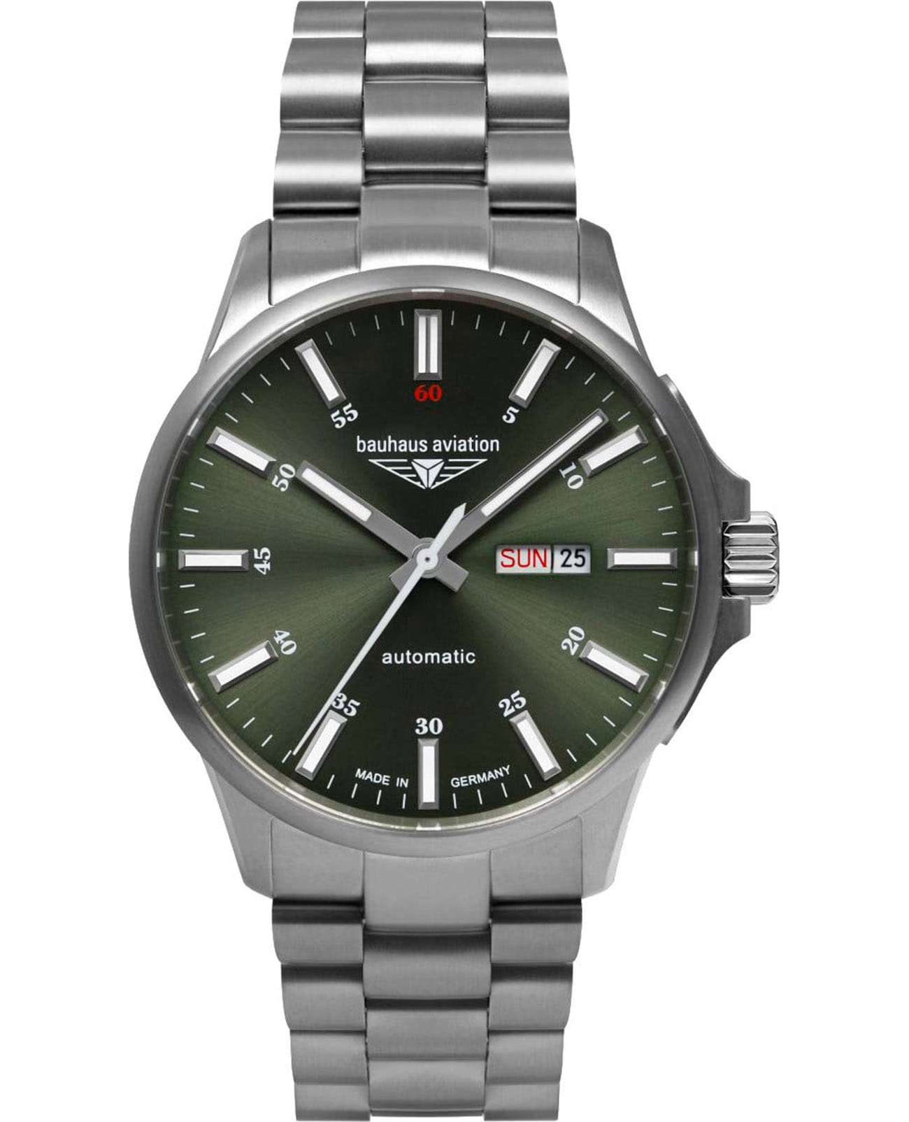 Мужские механические часы с автоподзаводом Bauhaus — это функциональный аксессуар, вдохновлённый авиационными хронометрами. Корпус диаметром 42 мм и толщиной 13 мм выполнен из титана. Циферблат зелёного цвета выполнен по технологии Sunray («солнечные лучи») и оформлен штрихами и прямоугольными стрелками в стиле Baton. Окошки даты и дня недели расположены в положении 3 часов. Стрелки и метки с люминесцентным покрытиемЛюминесцентное покрытиеПозволяет считывать показания времени в темноте. Производители наносят на стрелки, часовые индексы, безель или поверхность циферблата светонакопительный состав, дающий холодное свечение., обеспечивающим хорошую читаемость в темноте. Циферблат защищён сапфировым стекломСапфировое стеклоПрочный и надёжный материал из кристалла сапфира синтетического происхождения, характеризующийся особой твёрдостью и устойчивостью к царапинам и повреждениям.. Механизм — автоматический калибр Miyota 8205 (21 камень). Рифлёная заводная головка с защитой обеспечивает надёжную настройку времени. Завинчивающаяся прозрачная задняя крышка позволяет наблюдать за работой механизма и повышает водонепроницаемость. Часы оснащены титановым браслетом на раскладной застёжкеРаскладная застёжкаТакой тип застёжки используется только на браслетах из металла. Она никогда не раскрывается полностью, происходит разделение на 2 и более частей. Раскладывающая застёжка снизит вероятность потери часов к минимуму.. Водонепроницаемость 100 м позволяет использовать часы для плавания и повседневного ношения. Идеальный выбор для тех, кто ценит немецкое качество, лёгкость и спортивный дизайн.
