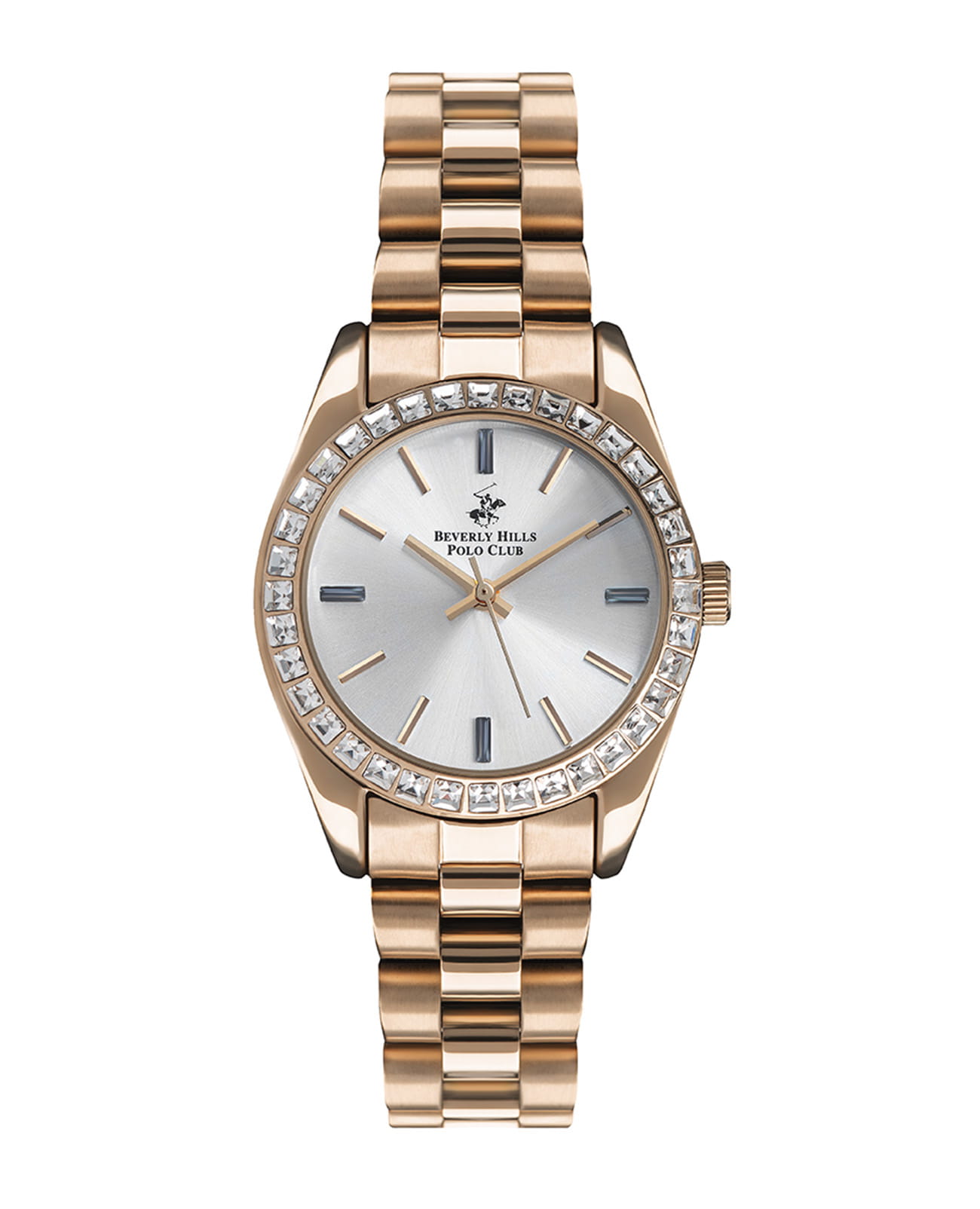 Американские женские часы с минеральным стекломМинеральное стеклоМинеральное стекло представляет собой искусственно выращенный минерал кварца. Такое стекло отличается особой устойчивостью к повреждениям и царапинам. Уступает по некоторым качествам сапфировому стеклу. Beverly Hills Polo Club BP3171C.430, с кварцевым механизмом с высокой точностью. Класс водозащиты: 30 метров, позволит защитить корпус от случайных брызг или капель дождя. БезельБезельВнешний ободок, закрепляющий стекло. В спортивных часах так называется поворотное кольцо с делениями на циферблате, выполняет роль таймера – замеряет отрезки времени на шкале. Неподвижный безель – элемент декора. Однонаправленно вращающийся безель на дайверских часах позволяет фиксировать моменты погружения и выныривания на поверхность. украшен кристаллами. Корпус часов изготовлен из суперметалла с IP-покрытиемIP-покрытиеМетод ионного напыления. Демонстрирует повышенную устойчивость к истиранию, окислению и химическим веществам. Под воздействием высокого давления и температуры около 1500°C молекулы металла надёжно соединяются с частицами корпуса часов.. Раскладная застёжкаРаскладная застёжкаТакой тип застёжки используется только на браслетах из металла. Она никогда не раскрывается полностью, происходит разделение на 2 и более частей. Раскладывающая застёжка снизит вероятность потери часов к минимуму..