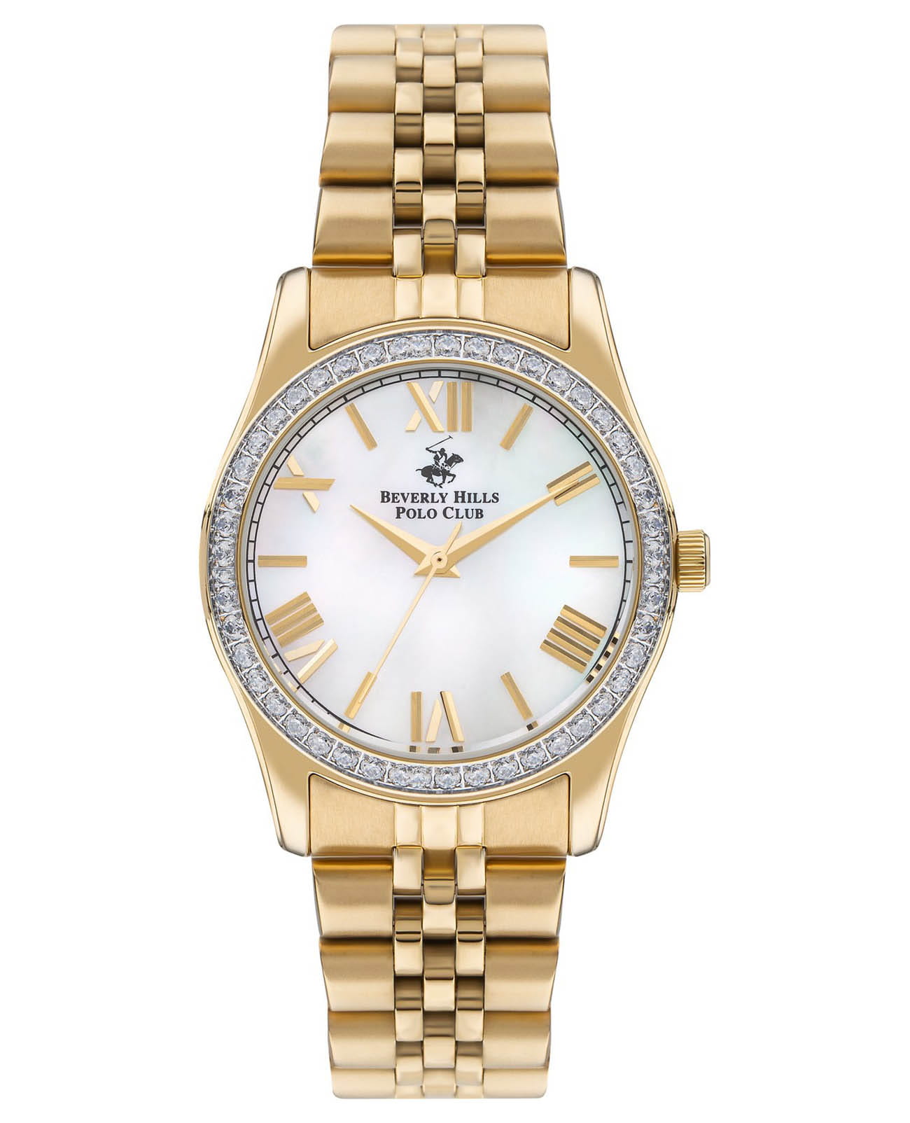 Американские женские часы с минеральным стекломМинеральное стеклоМинеральное стекло представляет собой искусственно выращенный минерал кварца. Такое стекло отличается особой устойчивостью к повреждениям и царапинам. Уступает по некоторым качествам сапфировому стеклу. Beverly Hills Polo Club BP3383C.120, кварцевый механизм с высокой точностью. Корпус и браслет часов изготовлены из нержавеющей стали с IP-покрытиемIP-покрытиеМетод ионного напыления. Демонстрирует повышенную устойчивость к истиранию, окислению и химическим веществам. Под воздействием высокого давления и температуры около 1500°C молекулы металла надёжно соединяются с частицами корпуса часов.. НеподвижныйбезельБезельВнешний ободок, закрепляющий стекло. В спортивных часах так называется поворотное кольцо с делениями на циферблате, выполняет роль таймера – замеряет отрезки времени на шкале. Неподвижный безель – элемент декора. Однонаправленно вращающийся безель на дайверских часах позволяет фиксировать моменты погружения и выныривания на поверхность. из нержавеющей стали с IP-покрытиемIP-покрытиеМетод ионного напыления. Демонстрирует повышенную устойчивость к истиранию, окислению и химическим веществам. Под воздействием высокого давления и температуры около 1500°C молекулы металла надёжно соединяются с частицами корпуса часов. украшен кристаллами. Класс водозащиты: 50 метров, позволит защитить корпус от случайных брызг или капель дождя. Стальной браслет на раскладной застёжкеРаскладная застёжкаТакой тип застёжки используется только на браслетах из металла. Она никогда не раскрывается полностью, происходит разделение на 2 и более частей. Раскладывающая застёжка снизит вероятность потери часов к минимуму..