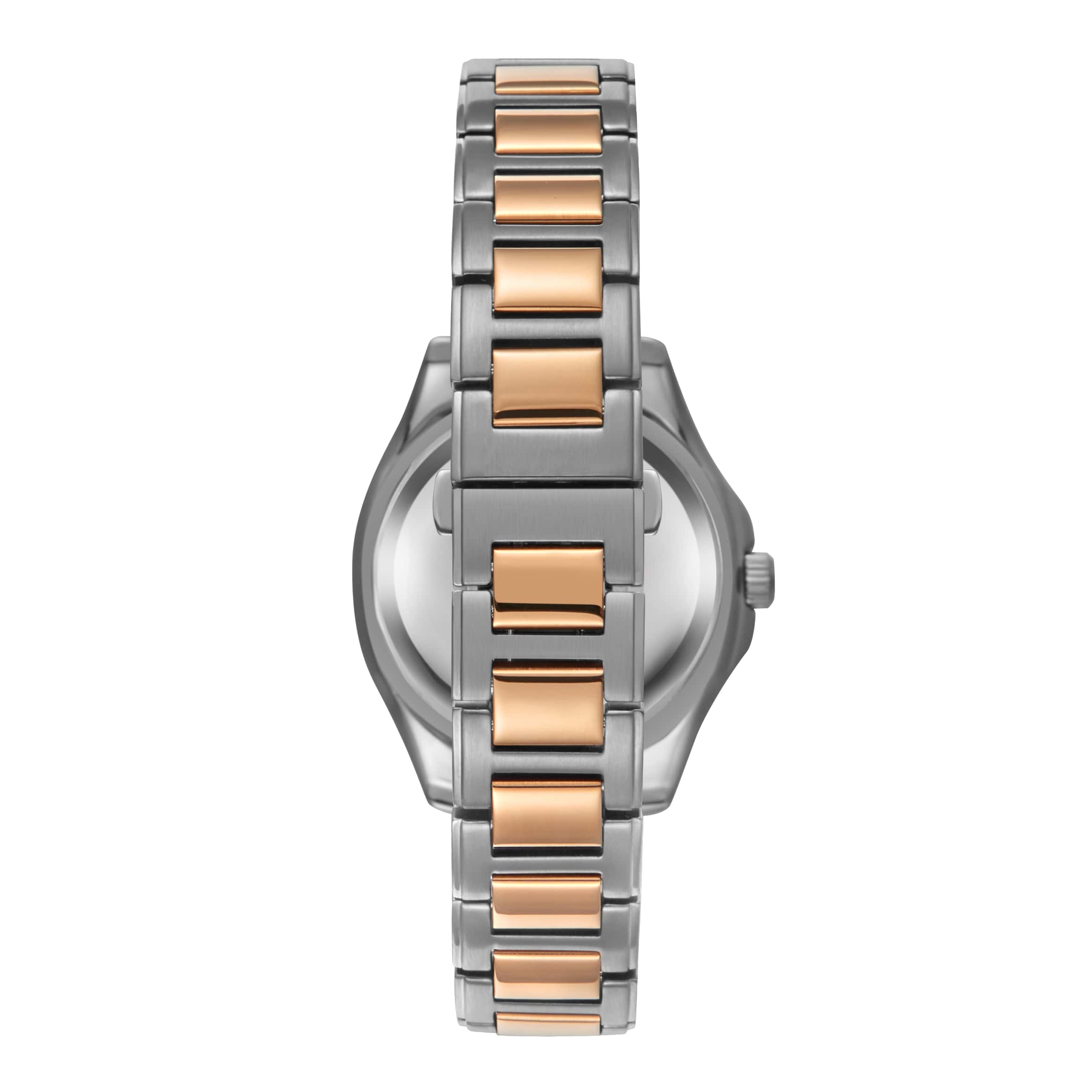 Beverly Hills Polo Club BP3700C.590 – элегантные женские часы, сочетающие стильный дизайн и высокую функциональность. Корпус диаметром 34 мм выполнен из суперметалла, обеспечивающего прочность и долговечность. Циферблат украшен, и защищён минеральным стекломМинеральное стеклоМинеральное стекло представляет собой искусственно выращенный минерал кварца. Такое стекло отличается особой устойчивостью к повреждениям и царапинам. Уступает по некоторым качествам сапфировому стеклу., устойчивым к царапинам. БезельБезельВнешний ободок, закрепляющий стекло. В спортивных часах так называется поворотное кольцо с делениями на циферблате, выполняет роль таймера – замеряет отрезки времени на шкале. Неподвижный безель – элемент декора. Однонаправленно вращающийся безель на дайверских часах позволяет фиксировать моменты погружения и выныривания на поверхность. с PVD-покрытиемPVDУльтратонкое покрытие наносится в технике вакуумного напыления, сочетает в себе нитрид титана особой прочности со слоем золота или оксида хрома. Несёт в себе декоративную или защитную функцию.. Часы оснащены точным кварцевым механизмом, гарантирующим надёжное отображение времени. Браслет из нержавеющей стали с PVD-покрытиемPVDУльтратонкое покрытие наносится в технике вакуумного напыления, сочетает в себе нитрид титана особой прочности со слоем золота или оксида хрома. Несёт в себе декоративную или защитную функцию. на застёжке-бабочке с кнопкамиЗастёжка "бабочка"Такой вид застёжки дополняется предохранителями, помогающими избежать случайного раскрытия браслета. Обладают изящным исполнением. , обеспечивающей комфортное ношение и надёжную фиксацию на запястье. Водозащита до 50 метров (5 ATM) позволяет использовать часы в повседневной жизни, включая кратковременное погружение в воду.