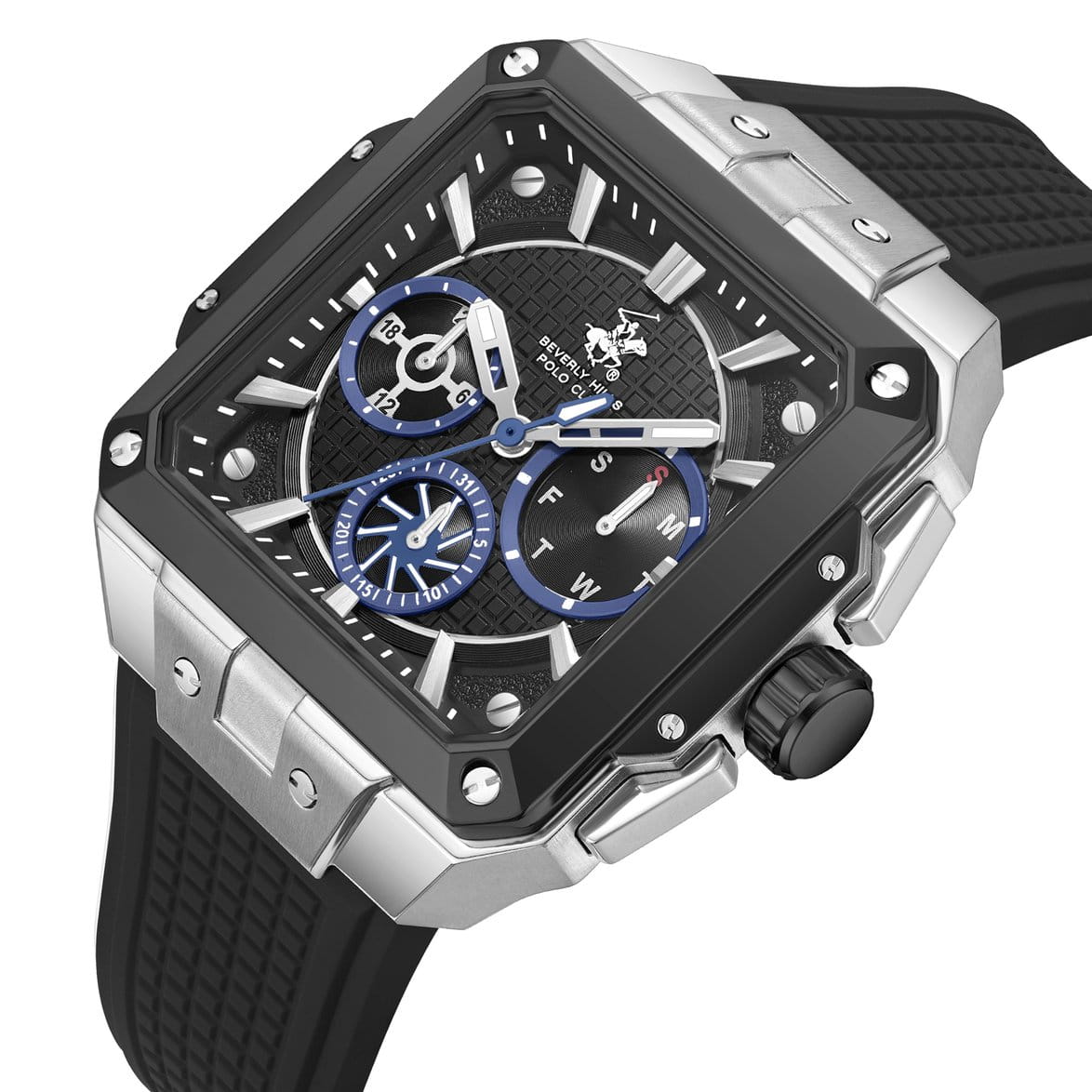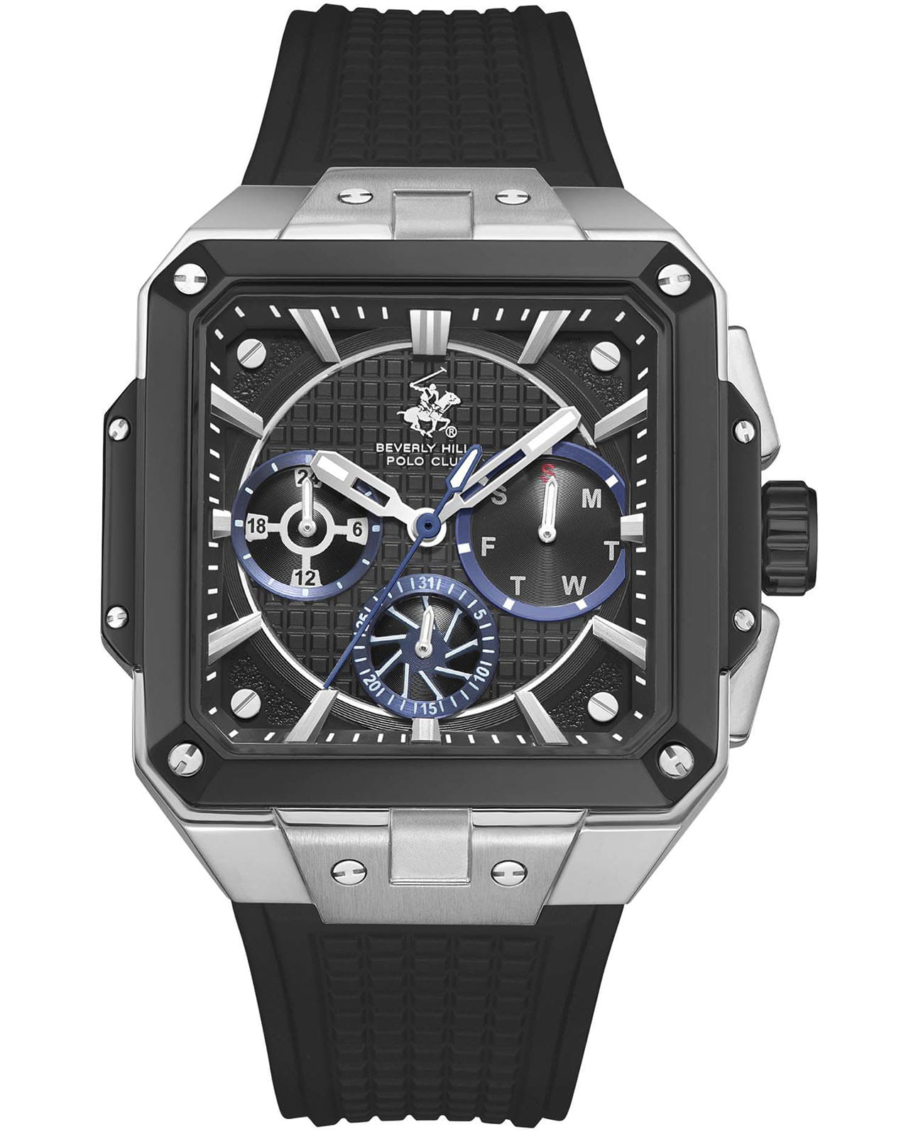 Мужские кварцевые часы Beverly Hills Polo Club — это гармоничное сочетание силы, стиля и современных технологий. Корпус размером 40×40 мм выполнен из нержавеющей стали. БезельБезельВнешний ободок, закрепляющий стекло. В спортивных часах так называется поворотное кольцо с делениями на циферблате, выполняет роль таймера – замеряет отрезки времени на шкале. Неподвижный безель – элемент декора. Однонаправленно вращающийся безель на дайверских часах позволяет фиксировать моменты погружения и выныривания на поверхность. с IP-покрытиемIP-покрытиеМетод ионного напыления. Демонстрирует повышенную устойчивость к истиранию, окислению и химическим веществам. Под воздействием высокого давления и температуры около 1500°C молекулы металла надёжно соединяются с частицами корпуса часов.. Циферблат чёрного цвета оформлен штрихами, стрелками и тремя вынесенными субциферблатами: для отображения дня недели, даты и 24-часового формата времени. Стрелки с люминесцентным покрытиемЛюминесцентное покрытиеПозволяет считывать показания времени в темноте. Производители наносят на стрелки, часовые индексы, безель или поверхность циферблата светонакопительный состав, дающий холодное свечение., обеспечивающим хорошую читаемость в темноте. Циферблат защищён минеральным стекломМинеральное стеклоМинеральное стекло представляет собой искусственно выращенный минерал кварца. Такое стекло отличается особой устойчивостью к повреждениям и царапинам. Уступает по некоторым качествам сапфировому стеклу.. Часы оснащены каучуковым ремешком на классической пряжке. Водонепроницаемость 100 м позволяет использовать часы для плавания и повседневного ношения. Идеальный выбор для тех, кто ценит американское качество и универсальный дизайн.