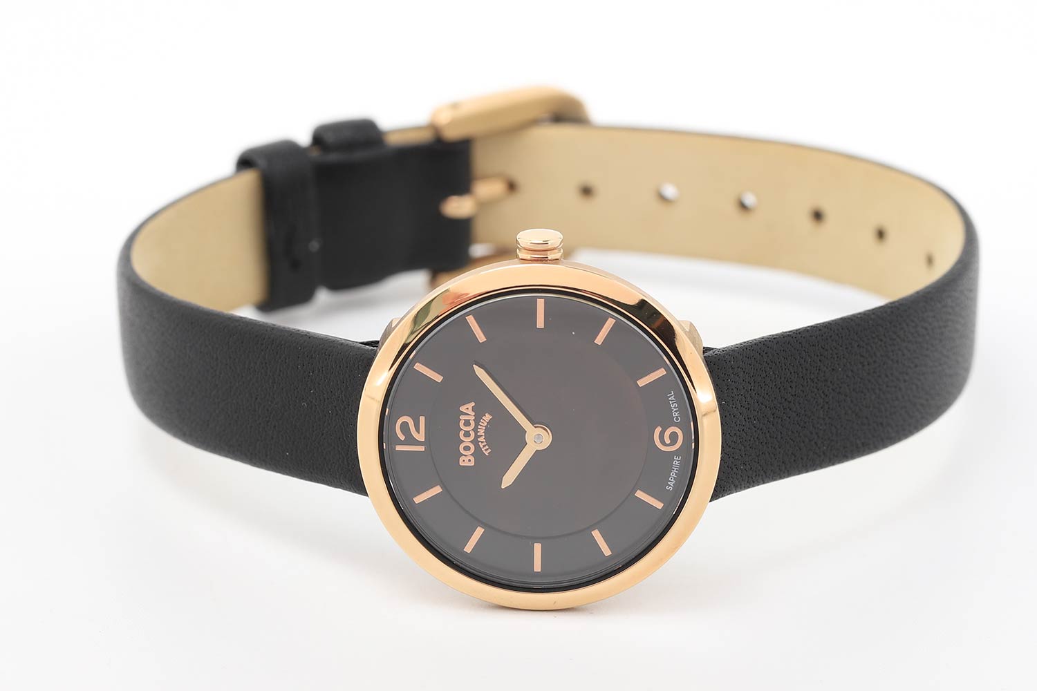 Женские наручные часы Boccia Titanium 3266-03 с надёжным кварцевым механизмом. Корпус часов изготовлен из нержавеющей стали с PVD-покрытиемPVDУльтратонкое покрытие наносится в технике вакуумного напыления, сочетает в себе нитрид титана особой прочности со слоем золота или оксида хрома. Несёт в себе декоративную или защитную функцию.. Кожаный ремешок на стандартной застёжке. Сапфировое стеклоСапфировое стеклоПрочный и надёжный материал из кристалла сапфира синтетического происхождения, характеризующийся особой твёрдостью и устойчивостью к царапинам и повреждениям. устойчивое к мелким механическим повреждениям. Класс водозащиты: 30 метров, позволит защитить корпус от случайных брызг или капель дождя.