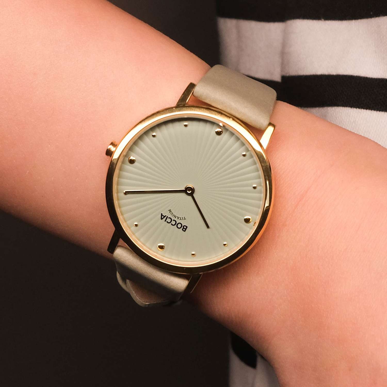 Элегантные женские часы Boccia 3365-04 станут неотъемлемой частью вашего повседневного стиля. Эти часы оборудованы надежным кварцевым механизмом Miyota GL22, обеспечивающим высокую точность и бесперебойную работу. Центральные часовая и минутная стрелки изящно выделяются на стильном оливковом циферблате, создавая гармоничный и современный образ. Корпус часов выполнен из суперлегкого титана, что делает их не только прочными, но и комфортными в ношении. Круглый корпус диаметром 34 мм придаёт часам классический и универсальный вид. Зеленый кожаный ремешок с традиционной застежкой идеально дополняет общий дизайн, добавляя яркий акцент. Прочное минеральное стеклоМинеральное стеклоМинеральное стекло представляет собой искусственно выращенный минерал кварца. Такое стекло отличается особой устойчивостью к повреждениям и царапинам. Уступает по некоторым качествам сапфировому стеклу. защищает циферблат от мелких механических повреждений, обеспечивая долговечность и сохранение первоначального внешнего вида. Водостойкость уровня WR 50 позволяет не беспокоиться о попадании влаги при мытье рук или в дождливую погоду.