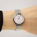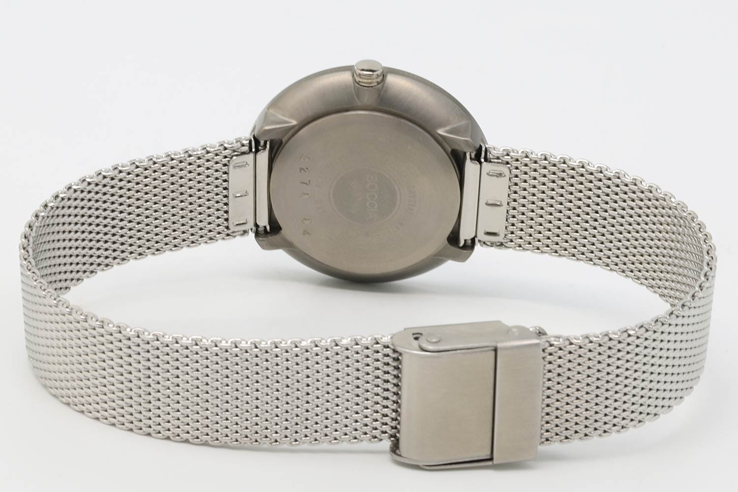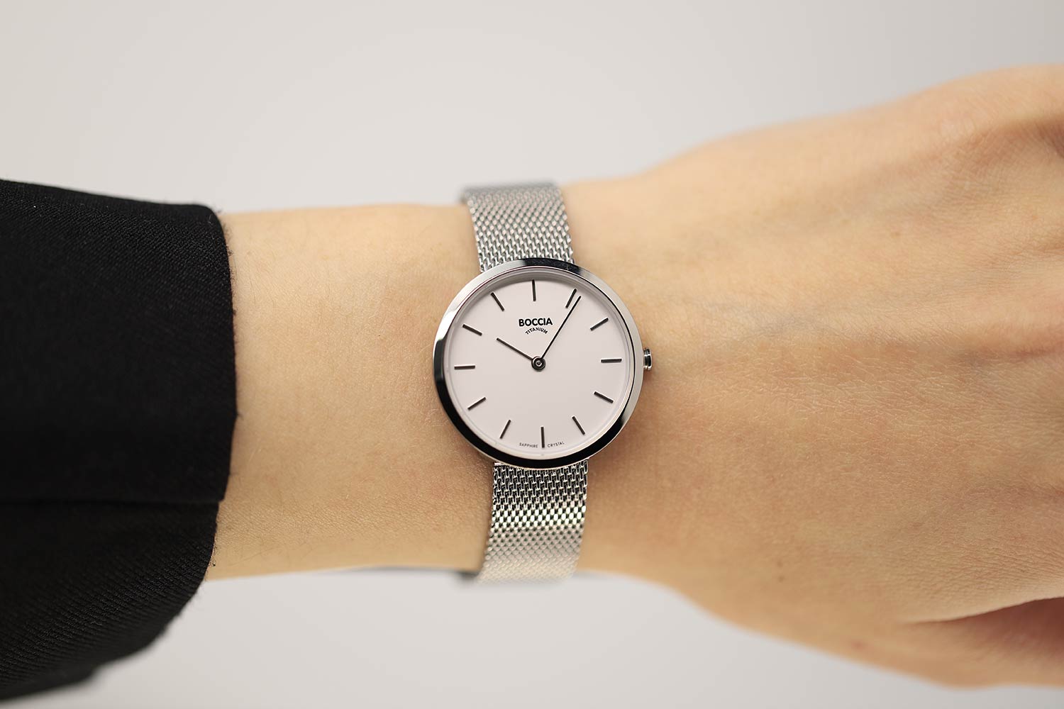 Женские наручные часы Boccia Titanium 3279-04 с надёжным кварцевым механизмом. Корпус часов изготовлен из титана. Сапфировое стеклоСапфировое стеклоПрочный и надёжный материал из кристалла сапфира синтетического происхождения, характеризующийся особой твёрдостью и устойчивостью к царапинам и повреждениям. устойчивое к мелким механическим повреждениям. Класс водозащиты: 30 метров, позволит защитить корпус от случайных брызг или капель дождя. Стальной браслет миланского плетения на раскладном замкеРаскладной замокДанный вариант застежки используется только на часах с металлическим браслетом. Отличительная особенность такого крепления в том, что длина браслета становится универсальной и вы можете самостоятельно отрегулировать нужный вам размер – застежка просто двигается по браслету часов.