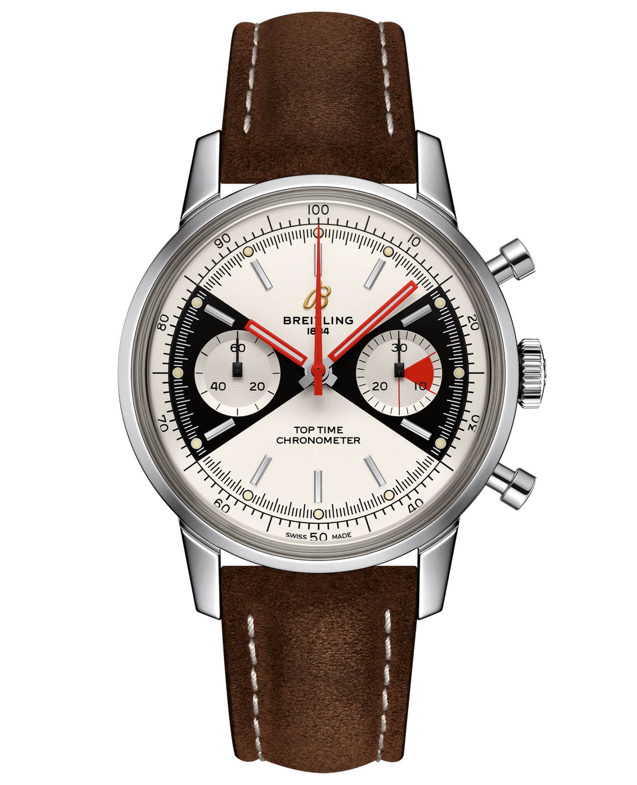 Модель Breitling Top Time отличается необычным дизайном и предназначена для мужчин и женщин, для которых важны традиции, стиль и высокие технические характеристики. Появившиеся в 60-х годах прошлого века часы Top Time создавались как ультрасовременные хронографы для вполне определенной аудитории – молодых и активных профессионалов. Благодаря спортивному характеру они привлекли внимание не только молодых мужчин, но и женщин, оценивших смелый дизайн и безусловную элегантность модели. Часы имеют корпус из нержавеющей стали диаметром 41 мм и предлагаются в комплекте с коричневым ремешком из нубука с классической стальной застежкой. Модель оснащена хронографическим калибром Breitling Caliber 23, сертифицированным Швейцарским институтом официального тестирования хронометров (COSC), и выпущена ограниченным тиражом в 2000 экземпляров.