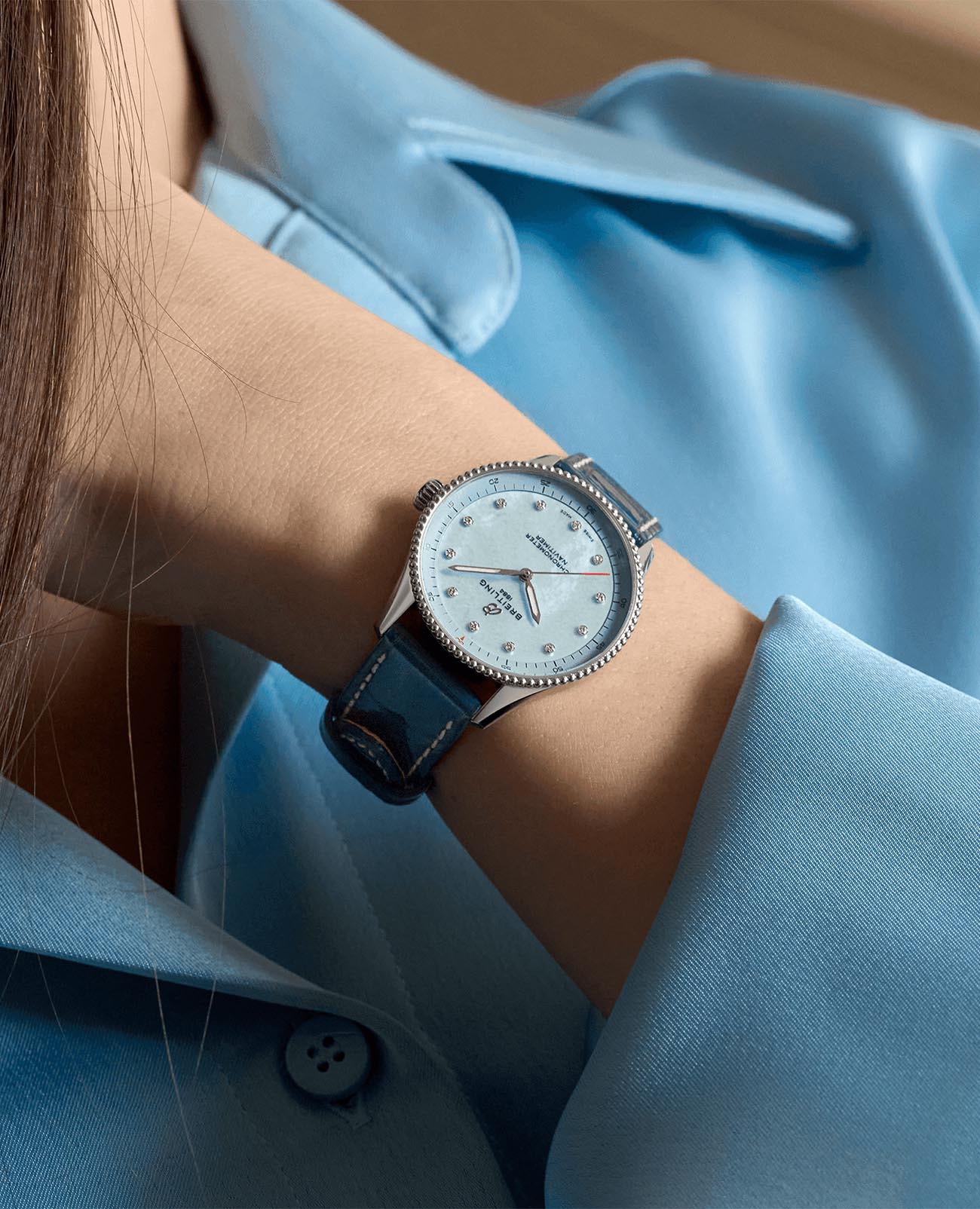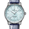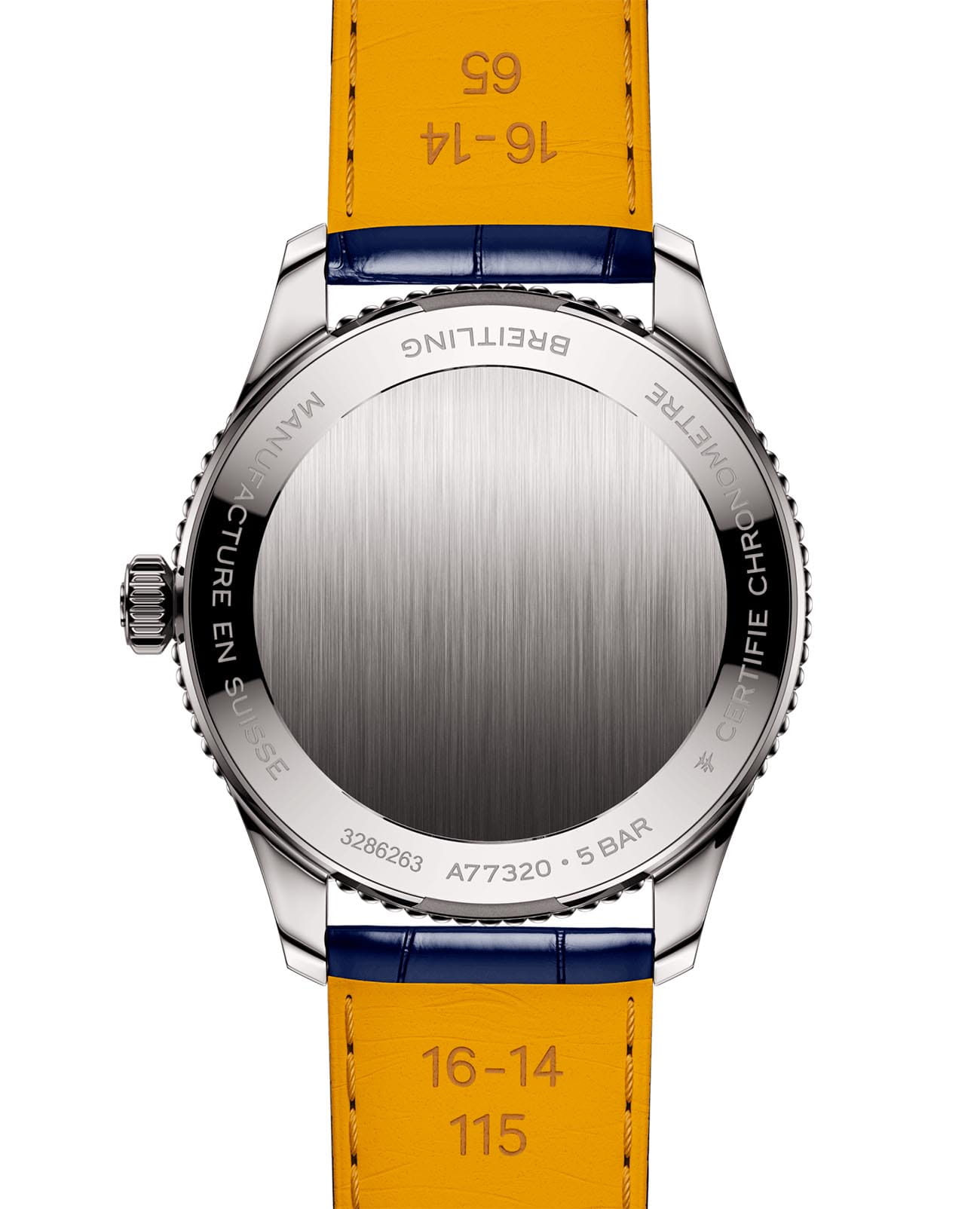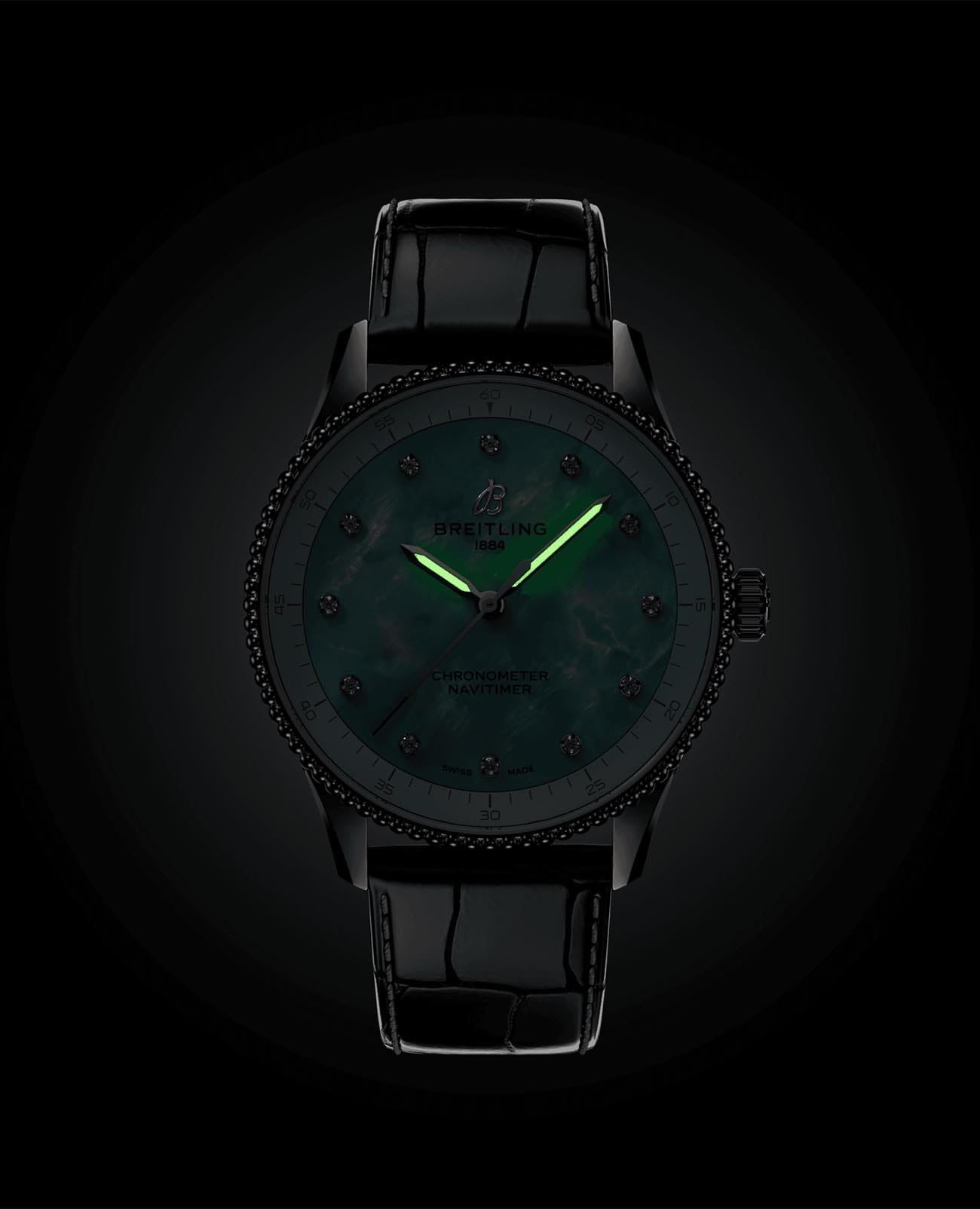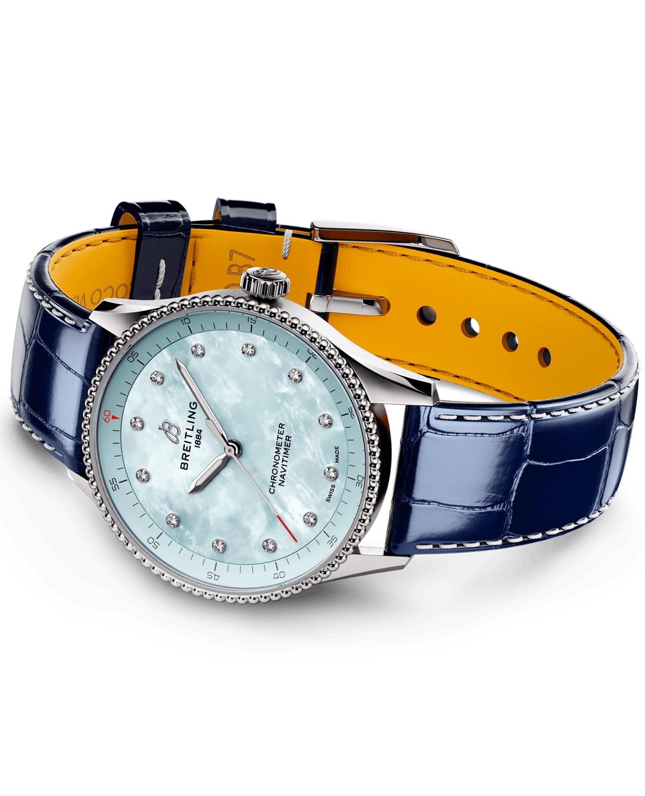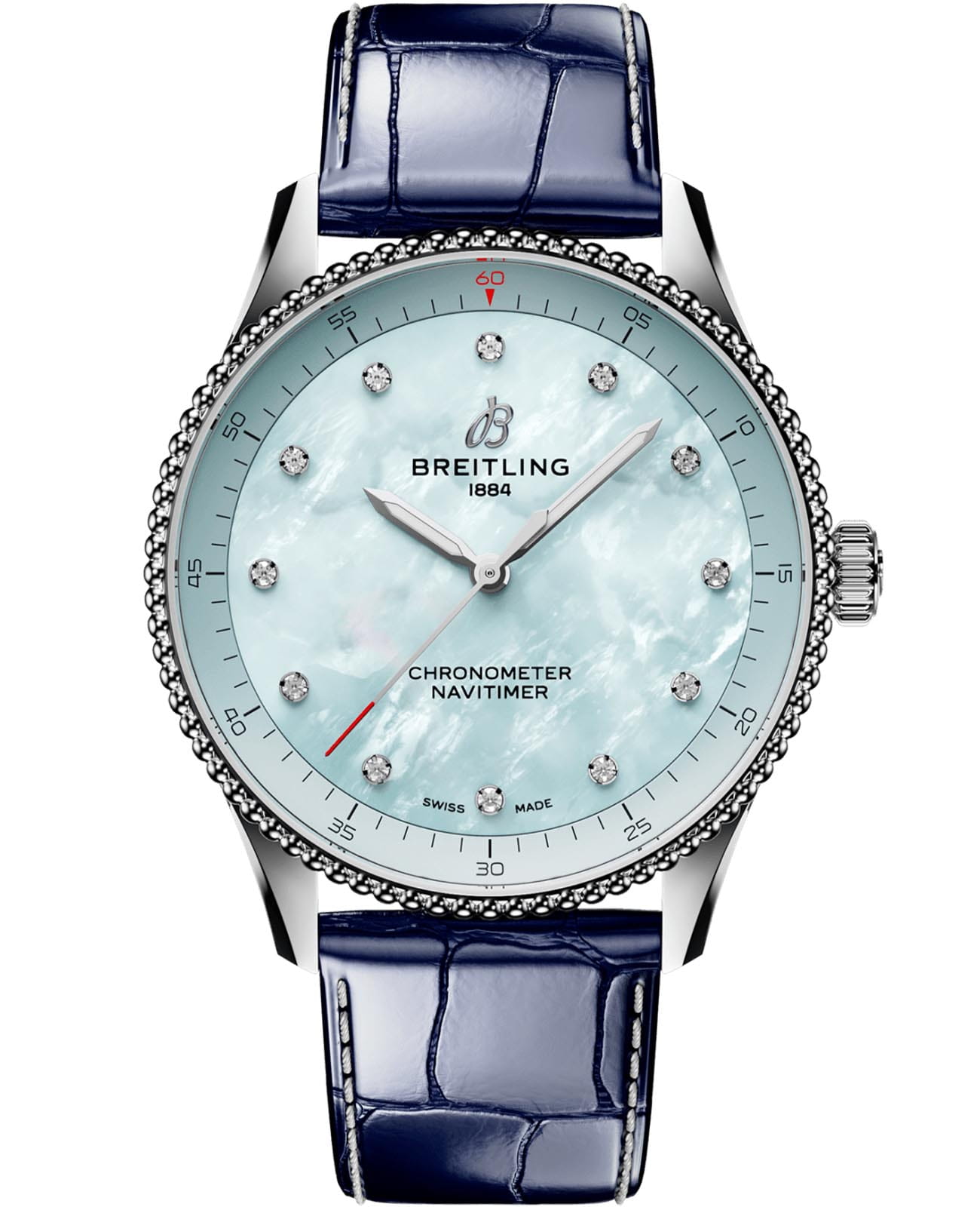 Швейцарские унисекс часы-хронометр Breitling Navitimer Automatic 36 A77320171C1P1, механический механизм (автоматический калибр) с высокой точностью. Сапфировое стеклоСапфировое стеклоПрочный и надёжный материал из кристалла сапфира синтетического происхождения, характеризующийся особой твёрдостью и устойчивостью к царапинам и повреждениям. устойчивое к появлению царапин, обладающее высокой прозрачностью. Класс водозащиты: 50 метров, позволит защитить корпус от случайных брызг или капель дождя. Корпус часов изготовлен из нержавеющей стали. Ремешок из кожи аллигатора с раскладной застёжкойРаскладная застёжкаТакой тип застёжки используется только на браслетах из металла. Она никогда не раскрывается полностью, происходит разделение на 2 и более частей. Раскладывающая застёжка снизит вероятность потери часов к минимуму.. Стрелки с люминесцентным покрытиемЛюминесцентное покрытиеПозволяет считывать показания времени в темноте. Производители наносят на стрелки, часовые индексы, безель или поверхность циферблата светонакопительный состав, дающий холодное свечение.. Циферблат инкрустирован бриллантами.