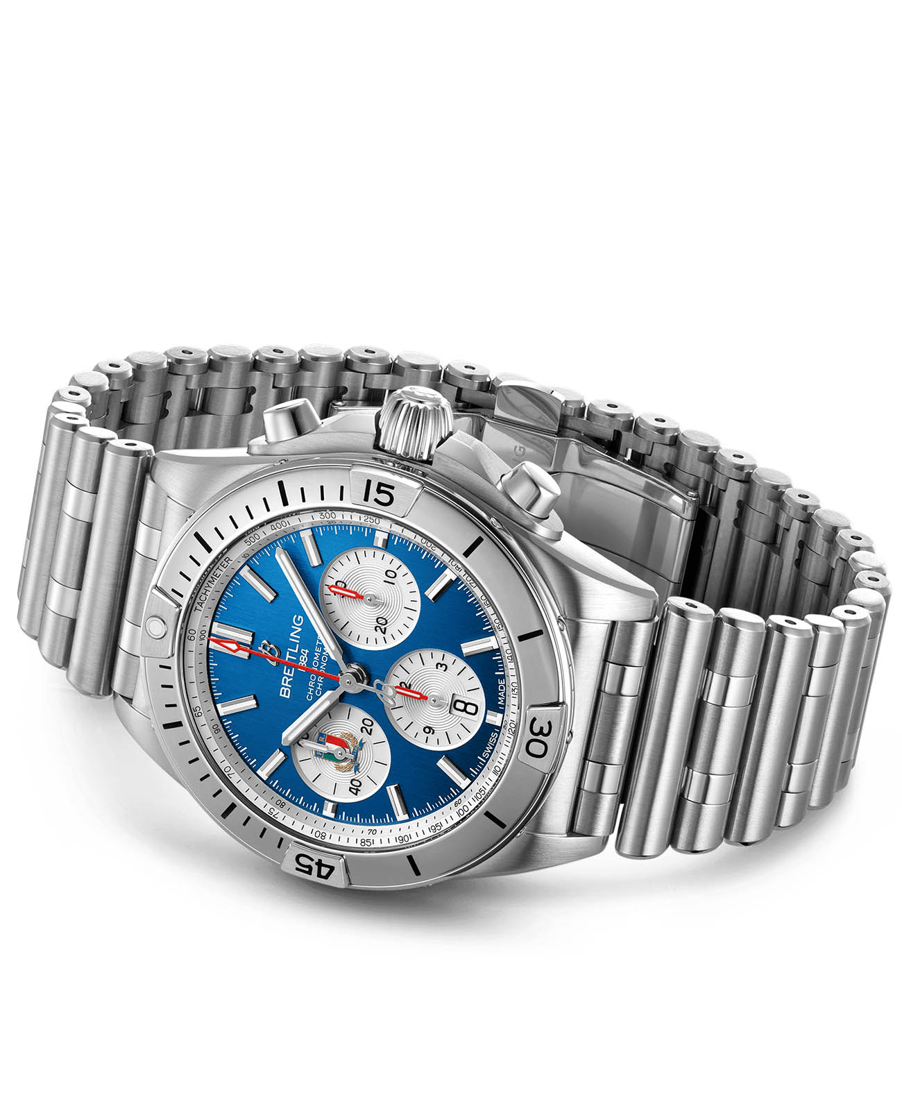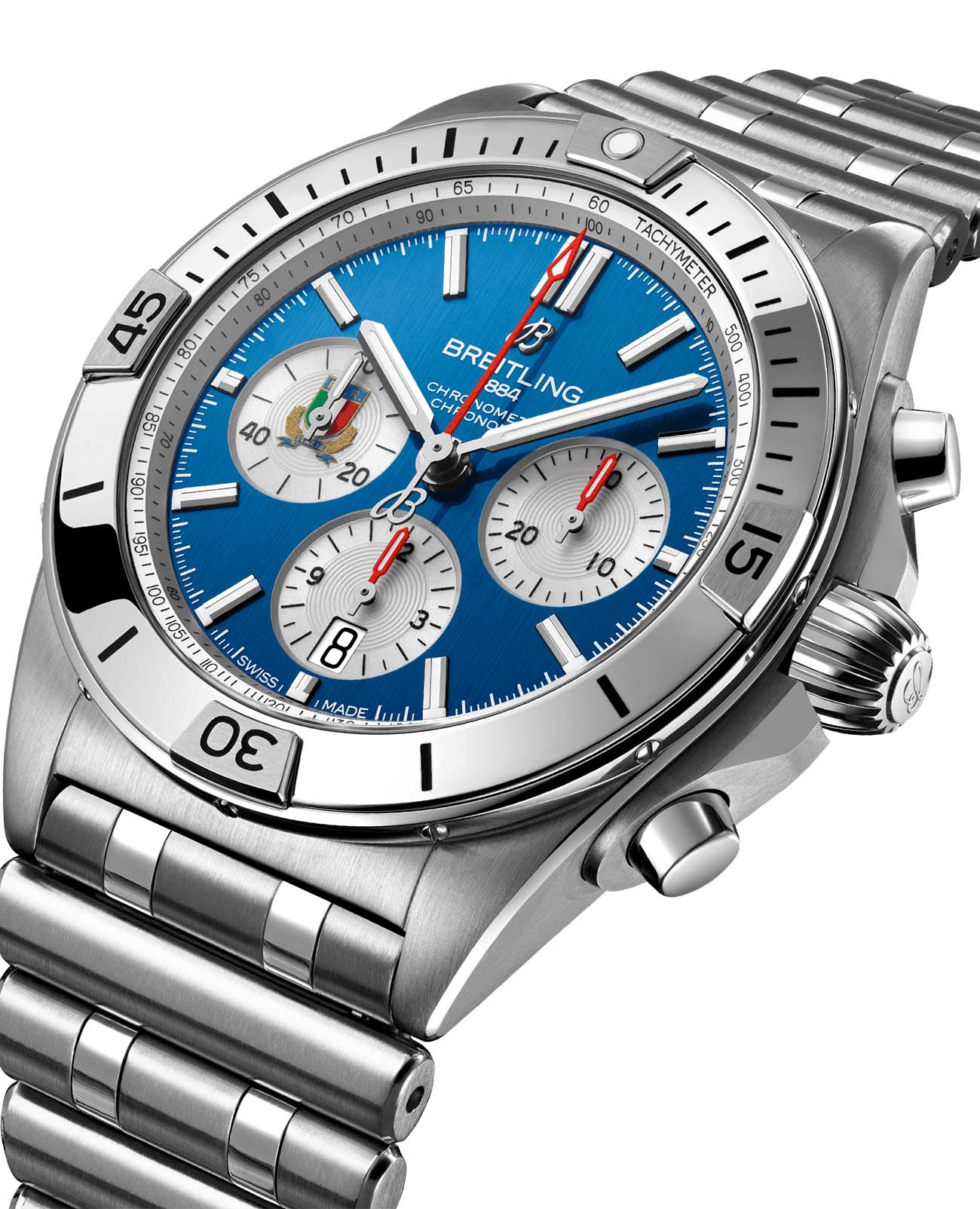 Мужские швейцарские часы-хронограф с секундомером Breitling Chronomat B01 42 Six Nations Italy AB0134A41C1A1, механический механизм (автоматический калибр) с высокой точностью. Сапфировое стеклоСапфировое стеклоПрочный и надёжный материал из кристалла сапфира синтетического происхождения, характеризующийся особой твёрдостью и устойчивостью к царапинам и повреждениям. устойчивое к появлению царапин, обладающее высокой прозрачностью. Класс водозащиты: 200 метров, позволит плавать, нырять и заниматься другими водными видами спорта. Корпус часов изготовлен из нержавеющей стали. Стальной браслет на застёжке «бабочка» с кнопкамиЗастёжка "бабочка"Такой вид застёжки дополняется предохранителями, помогающими избежать случайного раскрытия браслета. Обладают изящным исполнением. . Стрелки и метки с люминесцентным покрытиемЛюминесцентное покрытиеПозволяет считывать показания времени в темноте. Производители наносят на стрелки, часовые индексы, безель или поверхность циферблата светонакопительный состав, дающий холодное свечение.. Шкала тахиметра на циферблате. Окошко даты находится в положении 6 часов.