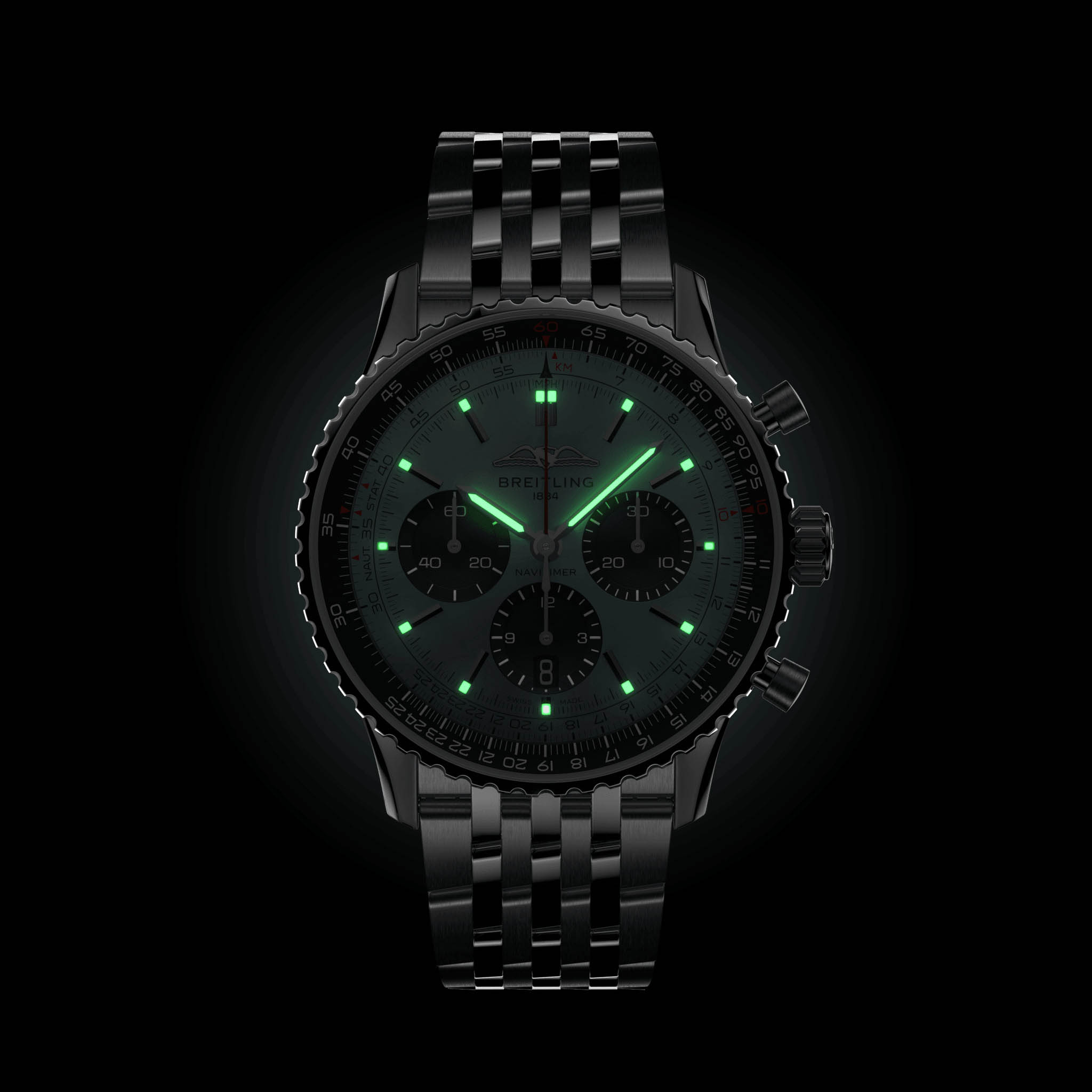 Мужские швейцарские часы-хронографХронографФункция позволяет измерять отрезки времени с особой точностью: часы, минуты, секунды. Верным признаком хронографа является наличие на циферблате 3 дополнительных окошек-счётчиков. с секундомеромСекундомерСекундоме́р — прибор, способный измерять интервалы времени с точностью до долей секунды. Breitling Navitimer B01 Chronograph 43 AB0138241C1A1, механический механизм (автоматический калибр) с высокой точностью. Сапфировое стеклоСапфировое стеклоПрочный и надёжный материал из кристалла сапфира синтетического происхождения, характеризующийся особой твёрдостью и устойчивостью к царапинам и повреждениям. с антибликовым покрытием устойчивое к появлению царапин, обладающее высокой прозрачностью. Класс водозащиты: 30 метров, позволит защитить корпус от случайных брызг или капель дождя. Корпус часов изготовлен из стали. Стальной браслет с застёжкой-бабочкой с кнопкамиЗастёжка "бабочка"Такой вид застёжки дополняется предохранителями, помогающими избежать случайного раскрытия браслета. Обладают изящным исполнением. . Шкала тахиметраТахиметрРазмеченная шкала, располагается на ободке или безеле часов. Тахиметр позволяет рассчитать скорость на определённом участке пути, расстояние измеряется в километрах или милях. на циферблате. Часы имеют сертификат COSCСертификат COSCОфициальный сертификат, подтверждающий то, что часы ходят с особо высокой точностью. Для получения документа часы подвергаются тестовым испытаниям, разработанным швейцарским институтом тестирования хронометров COSC. Допустимая норма для механических часов -4/+6 секунд в день, для кварцевых моделей +/- 0,07 секунд в день.. Окошко даты находится в положении 6 часов. Стрелки и метки с люминесцентным покрытиемЛюминесцентное покрытиеПозволяет считывать показания времени в темноте. Производители наносят на стрелки, часовые индексы, безель или поверхность циферблата светонакопительный состав, дающий холодное свечение..