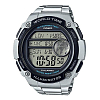 Японские спортивные наручные кварцевые мужские часы с пятью будильниками. ЖК циферблат серого цвета. Корпус - Пластиковый; Стекло - Минеральное; Водозащита - 100 м. (WR 100); Материал ремешка - Нержавеющая сталь; Цвет ремешка - Серебристый; Цвет циферблата - Lcd.