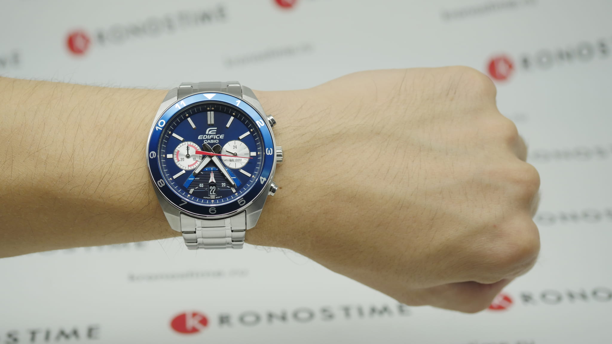 Японские мужские часы-хронографХронографФункция позволяет измерять отрезки времени с особой точностью: часы, минуты, секунды. Верным признаком хронографа является наличие на циферблате 3 дополнительных окошек-счётчиков. Casio Edifice EFV-590D-2AVUDF. Минеральное стеклоМинеральное стеклоМинеральное стекло представляет собой искусственно выращенный минерал кварца. Такое стекло отличается особой устойчивостью к повреждениям и царапинам. Уступает по некоторым качествам сапфировому стеклу. устойчивое к появлению царапин, обладающее высокой прозрачностью. Корпус часов изготовлен из нержавеющей стали. БезельБезельВнешний ободок, закрепляющий стекло. В спортивных часах так называется поворотное кольцо с делениями на циферблате, выполняет роль таймера – замеряет отрезки времени на шкале. Неподвижный безель – элемент декора. Однонаправленно вращающийся безель на дайверских часах позволяет фиксировать моменты погружения и выныривания на поверхность. из стали с IP-покрытиемIP-покрытиеМетод ионного напыления. Демонстрирует повышенную устойчивость к истиранию, окислению и химическим веществам. Под воздействием высокого давления и температуры около 1500°C молекулы металла надёжно соединяются с частицами корпуса часов.. Светодиодная автоподсветка NeobriteПодсветка NeobriteИспользование светонакопительных составов на основе сульфида цинка или алюмината стронция, яркий свет можно наблюдать на протяжении 6-10 часов после «зарядки» часов около источника света. - при повороте часов в сторону лица подсветка дисплея осуществляется автоматически. Настраиваемое послесвечение 1,5 или 3сек. СекундомерСекундомерСекундоме́р — прибор, способный измерять интервалы времени с точностью до долей секунды. с точностью измерения 1/100 секунды и измерением до 23 часов 59 минут 59,99 cек. ТаймерТаймерОтсчитывает секунды в обратном направлении в заданном интервале времени. обратного отсчета (диапазон времени 24 часа), автоматический календарь, 12/24 отображение времени. Класс водозащиты: 100 метров, позволит плавать, нырять и заниматься другими водными видами спорта. Стальной браслет на раскладной застёжкеРаскладная застёжкаТакой тип застёжки используется только на браслетах из металла. Она никогда не раскрывается полностью, происходит разделение на 2 и более частей. Раскладывающая застёжка снизит вероятность потери часов к минимуму..