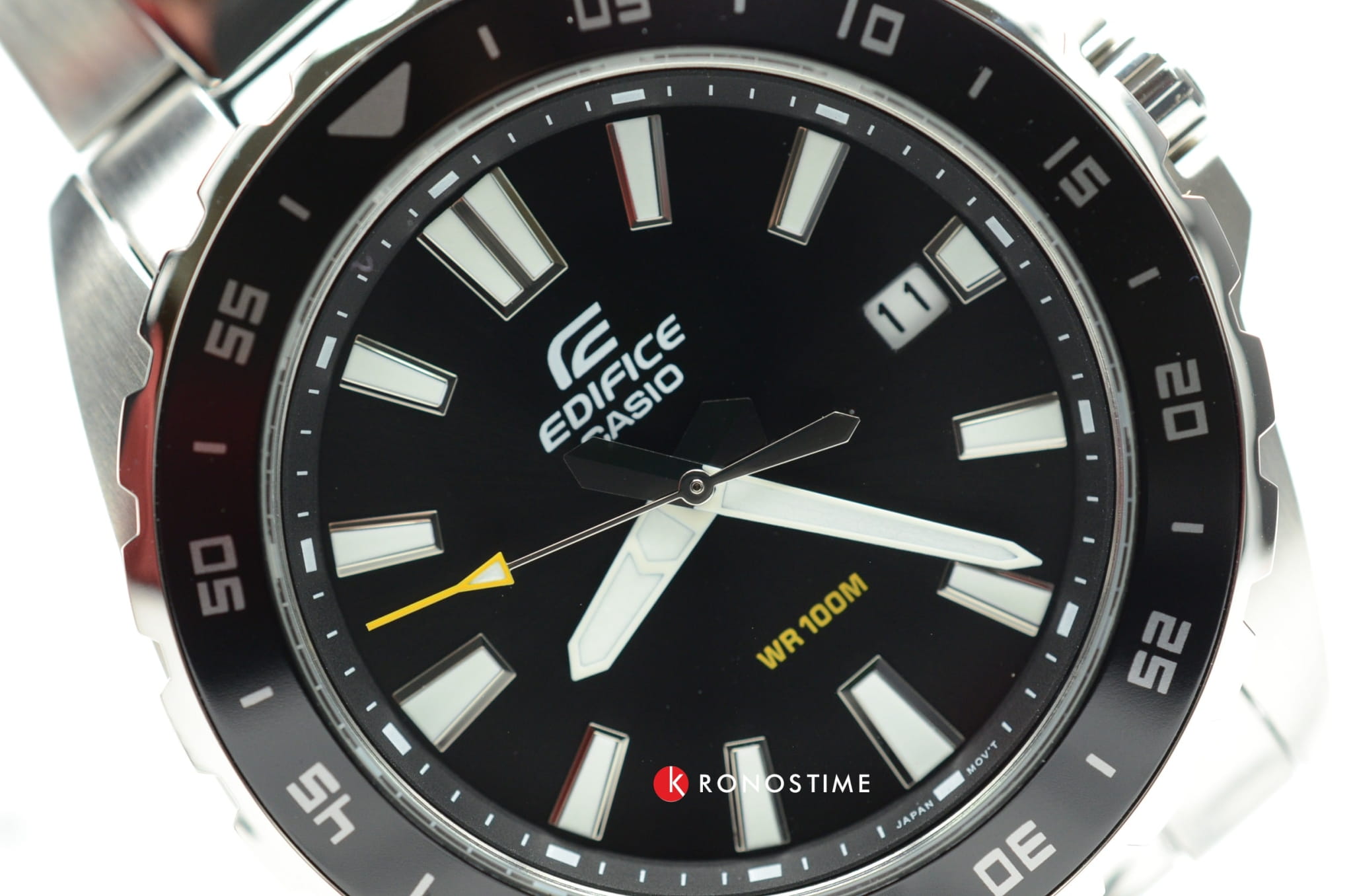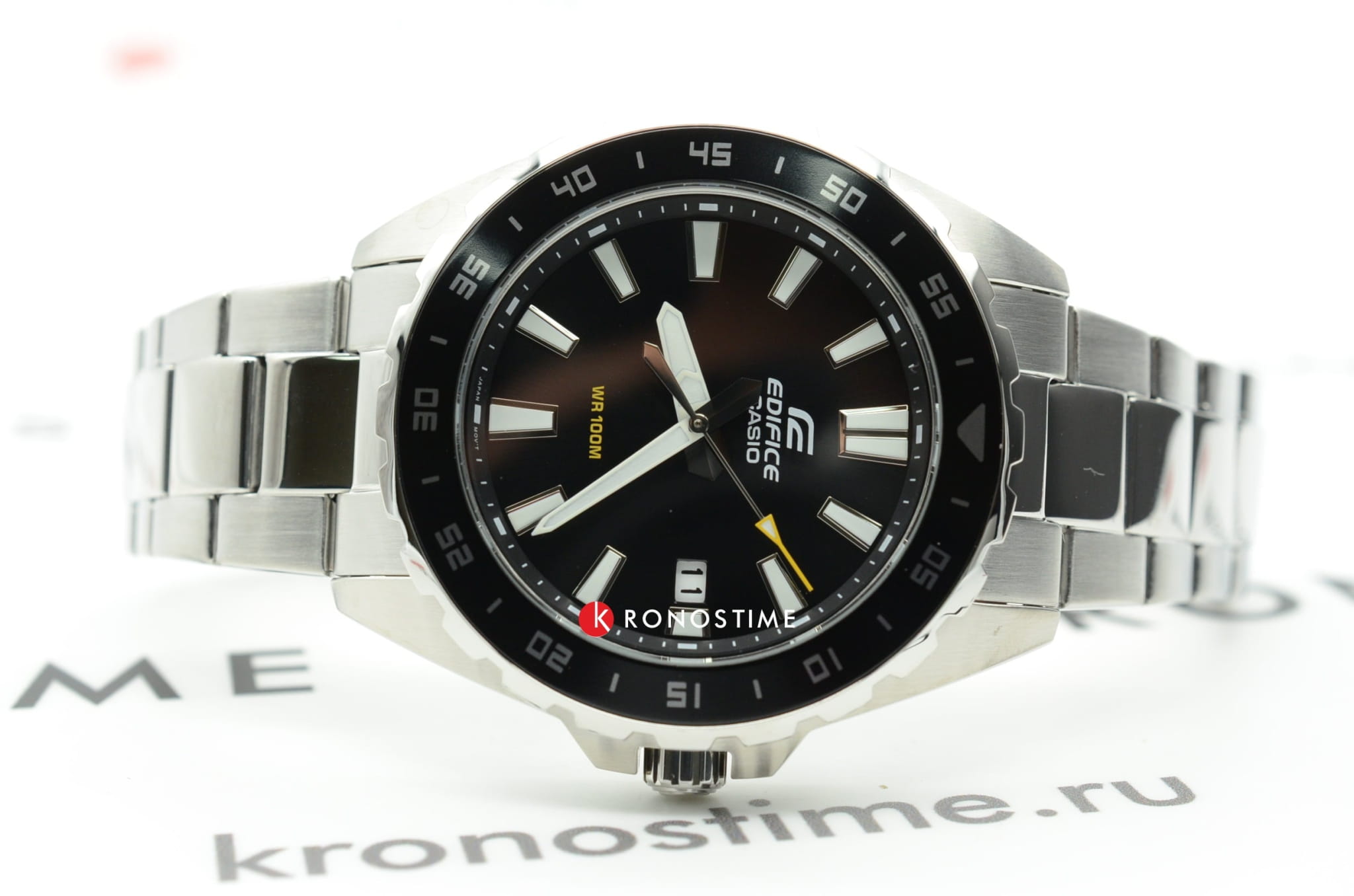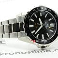 Серебристо-чёрная модель наделена элементами дайверского дизайна, повторяя внешний облик механических часов для дайвинга 1950-х годов, в глаза бросается массивный однонаправленно вращающийся безельБезельВнешний ободок, закрепляющий стекло. В спортивных часах так называется поворотное кольцо с делениями на циферблате, выполняет роль таймера – замеряет отрезки времени на шкале. Неподвижный безель – элемент декора. Однонаправленно вращающийся безель на дайверских часах позволяет фиксировать моменты погружения и выныривания на поверхность. с фигурным краем, крупные стрелки и часовые индексы. Секундная стрелка дополнена жёлтым наконечником, что обеспечивает превосходную читаемость показаний с циферблата. Кварцевый японский механизм с точностью хода часов +/- 20 секунд в месяц. Батарейка рассчитана на 3 года работы. Люминесцентная подсветка NeobriteПодсветка NeobriteИспользование светонакопительных составов на основе сульфида цинка или алюмината стронция, яркий свет можно наблюдать на протяжении 6-10 часов после «зарядки» часов около источника света.. Водонепроницаемость при давлении до 10 бар. Ударопрочный корпусУдаропрочный корпусМеханизм заключён в корпус, выполненный из современных материалов, устойчивых к ударам, механическим повреждениям и падению с высоты: инновационный пластик, карбон, нержавеющая сталь, титан. и браслет из нержавеющей стали 316L. Чёрное IP-покрытиеIP-покрытиеМетод ионного напыления. Демонстрирует повышенную устойчивость к истиранию, окислению и химическим веществам. Под воздействием высокого давления и температуры около 1500°C молекулы металла надёжно соединяются с частицами корпуса часов.. Минеральное стекло. Окошко индикации числа. Габариты: 42 x 37,8 x 9,4 мм.