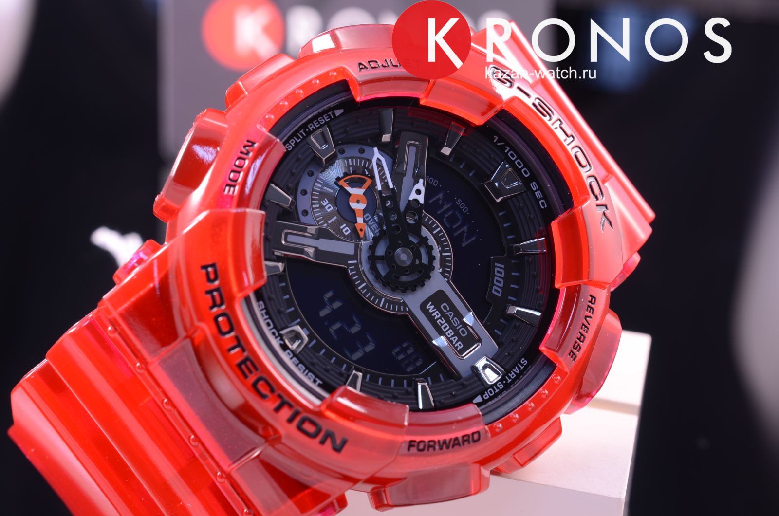 Наручные часы привлекают необычным дизайном и противоударным корпусомУдаропрочный корпусМеханизм заключён в корпус, выполненный из современных материалов, устойчивых к ударам, механическим повреждениям и падению с высоты: инновационный пластик, карбон, нержавеющая сталь, титан. из полупрозрачного полимерного пластика, красный цвет которого напоминает о кораллах. Оригинальным элементом стал счётчик на позиции 9 часов, оснащённый стрелкой в виде рыбки-клоуна. Японский кварцевый механизм работает от батарейки, эксплуатационный срок которой рассчитан на 2 года. Циферблат оснащён светодиодной подсветкойСветодиодная подсветкаСветодиодная или LED-подсветка обеспечивает появление яркого холодного свечения за счёт LED-элементов - маленьких лампочек. Они потребляют минимальное количество энергии, чаще всего можно встретить 1 светодиод, в нижней части циферблата.. Закаленное минеральное стекло. Сохранение водонепроницаемости до 20 бар. Гибкий и удобный полимерный ремешок. ХронографХронографФункция позволяет измерять отрезки времени с особой точностью: часы, минуты, секунды. Верным признаком хронографа является наличие на циферблате 3 дополнительных окошек-счётчиков., расчёт средней скорости пройденной дистанции, автоматический календарь, таймер с автоповтором, функция мирового времениМировое время Полезное часовое усложнение, отображающее время в основных городах и известных областях по всему миру, оно связано с часовыми поясами, удобно для путешественников и бизнесменов. - 29 часовых поясов, будильник, секундомер со звуковым сигналом, UTCUTCВсемирное кординационное время, не имеющее привязки к географическому положению Гринвича, основывается на атомном отсчёте времени. Регулировка времени осуществляется более точно, чем устаревшее GMT.
