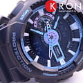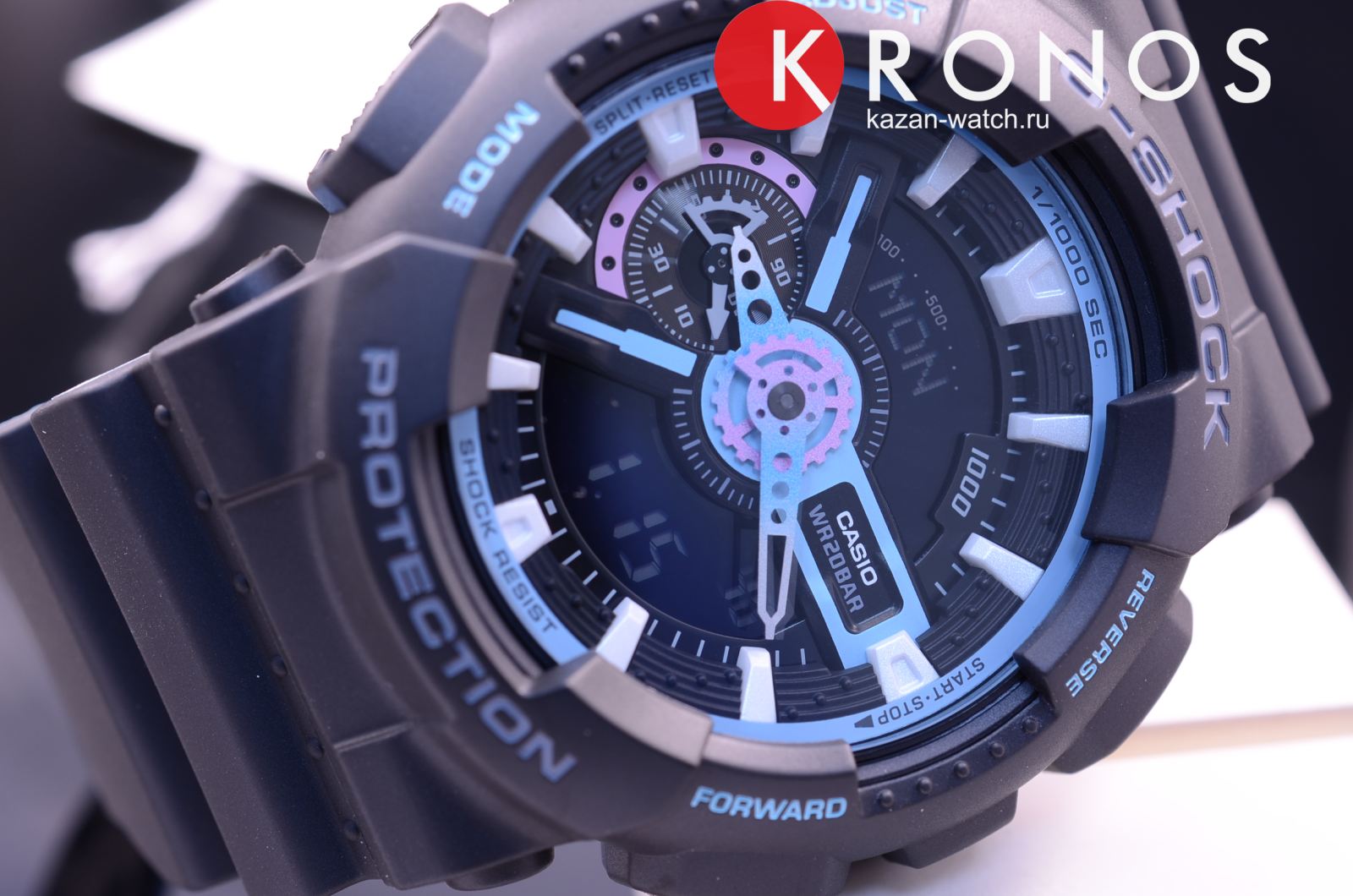 Элементы оформления напоминает лазерные и световые эффекты, без которых не обходятся концерты и ночные клубы. Оригинально смотрится двухцветный ремешок с внутренней стороной голубого цвета. Многоуровневый циферблат защищает закаленное минеральное стекло, устойчивое к царапинам. Японский кварцевый механизм получает питание от аккумулятора, срок службы которого составляет 2 года. Противоударный корпусУдаропрочный корпусМеханизм заключён в корпус, выполненный из современных материалов, устойчивых к ударам, механическим повреждениям и падению с высоты: инновационный пластик, карбон, нержавеющая сталь, титан. из полимерного пластика. Водонепроницаемость 20 бар. Устранение влияния магнитного поля. Светодиодная подсветкаСветодиодная подсветкаСветодиодная или LED-подсветка обеспечивает появление яркого холодного свечения за счёт LED-элементов - маленьких лампочек. Они потребляют минимальное количество энергии, чаще всего можно встретить 1 светодиод, в нижней части циферблата.. Секундомер, хронографХронографФункция позволяет измерять отрезки времени с особой точностью: часы, минуты, секунды. Верным признаком хронографа является наличие на циферблате 3 дополнительных окошек-счётчиков., расчёт средней скорости пройденного пути, календарь до 2099 года, мировое времяМировое время Полезное часовое усложнение, отображающее время в основных городах и известных областях по всему миру, оно связано с часовыми поясами, удобно для путешественников и бизнесменов. , таймер, будильник. Габариты: 55 x 51,2 x 16,9 мм.