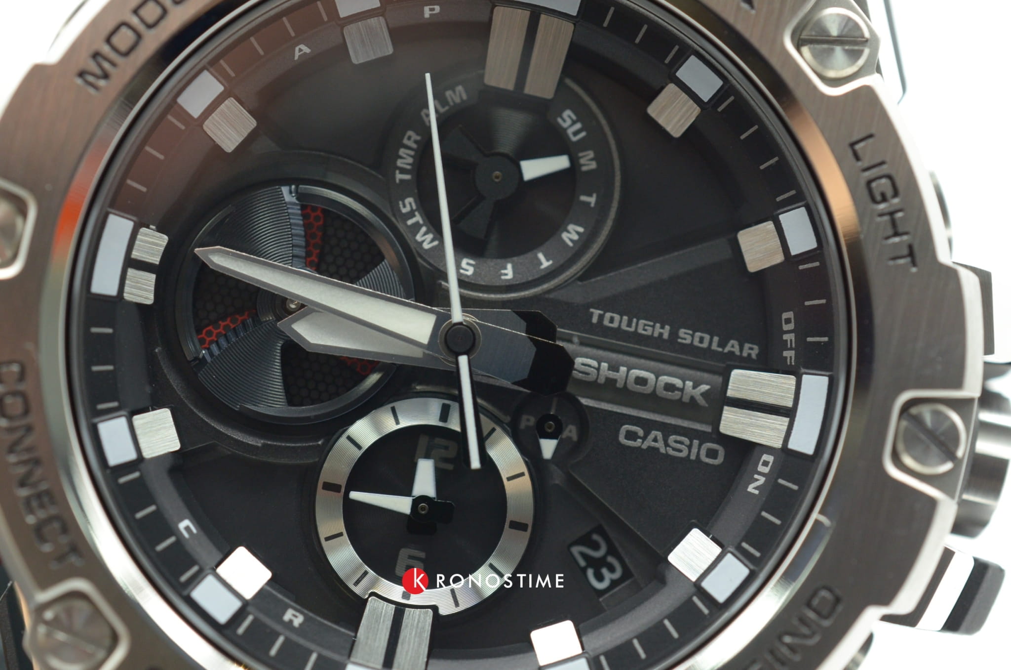 Наручные часы отражают динамичный характер. Необычным элементом стал счётчик у отметки 9 часов, имитирующий турбину. Он помогает контролировать уровень заряда батарейки, чем больше цвета вы видите, тем выше необходимость зарядить модель. Питание осуществляется за счёт солнечной батареи - технология . Также стоит обратить внимание на противоударный корпусУдаропрочный корпусМеханизм заключён в корпус, выполненный из современных материалов, устойчивых к ударам, механическим повреждениям и падению с высоты: инновационный пластик, карбон, нержавеющая сталь, титан. из пластика и стали 316L, такое усиленное сочетание позволяет добиться максимальной прочности. Надёжный стальной браслет. Минеральное стекло. СветодиоднаяСветодиодная подсветкаСветодиодная или LED-подсветка обеспечивает появление яркого холодного свечения за счёт LED-элементов - маленьких лампочек. Они потребляют минимальное количество энергии, чаще всего можно встретить 1 светодиод, в нижней части циферблата. и люминесцентная подсветкаЛюминесцентное покрытиеПозволяет считывать показания времени в темноте. Производители наносят на стрелки, часовые индексы, безель или поверхность циферблата светонакопительный состав, дающий холодное свечение.. Завинчивающаяся заводная головка. Возможности: BluetoothBluetoothСовременная технология, позволяющая синхронизировать часы с телефоном и переносить данные. Часы с Bluetooth расширяют возможности вашего смартфона и делают его использование ещё более удобным., ежедневный будильник, секундомер, хронографХронографФункция позволяет измерять отрезки времени с особой точностью: часы, минуты, секунды. Верным признаком хронографа является наличие на циферблате 3 дополнительных окошек-счётчиков., мировое времяМировое время Полезное часовое усложнение, отображающее время в основных городах и известных областях по всему миру, оно связано с часовыми поясами, удобно для путешественников и бизнесменов. , автоматический календарь, таймер. Габариты: 58,1 x 53,8 x 14,1 мм.