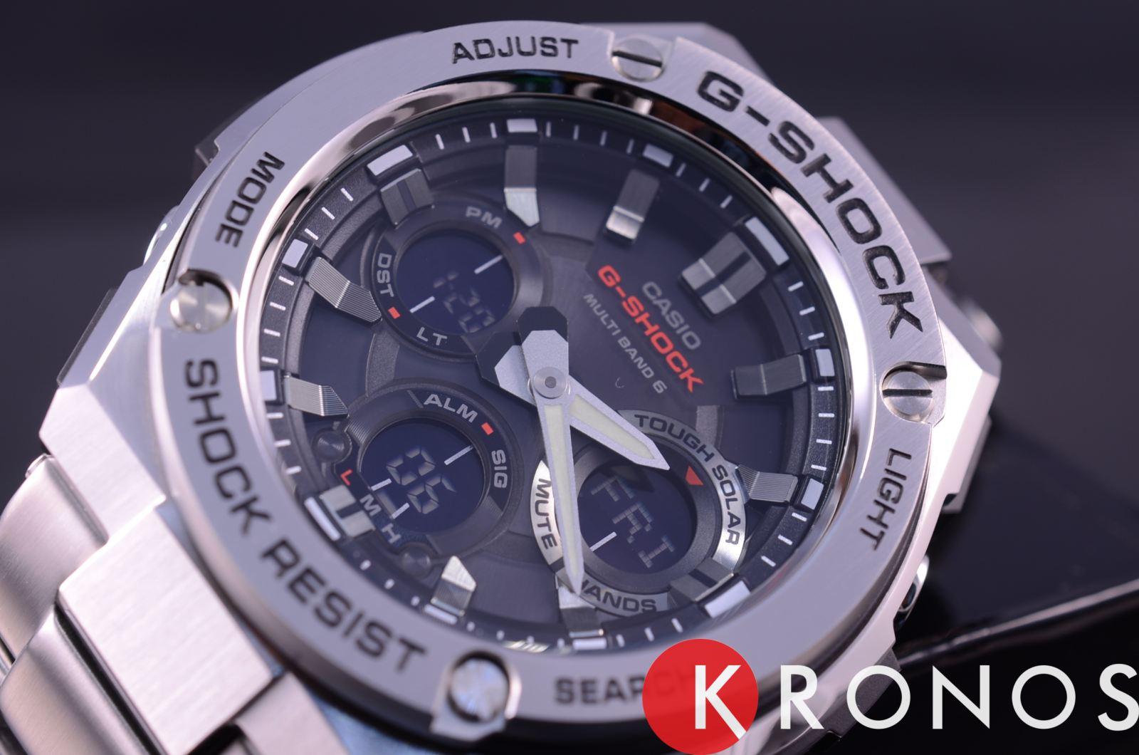 Лаконичный дизайн напоминает о классическом облике механических часов, серебристый блеск нержавеющей стали 316L никогда не потеряет актуальности. Противоударный корпусУдаропрочный корпусМеханизм заключён в корпус, выполненный из современных материалов, устойчивых к ударам, механическим повреждениям и падению с высоты: инновационный пластик, карбон, нержавеющая сталь, титан. с лёгкостью выдерживает любые нагрузки и падения с высоты, дополнительную устойчивость к повреждениям придаёт полимерная составляющая. Модель серии G-Steel - это часы на солнечной батарее , есть индикатор заряда аккумулятора. Минеральное стекло. Циферблат со светодиодной подсветкойСветодиодная подсветкаСветодиодная или LED-подсветка обеспечивает появление яркого холодного свечения за счёт LED-элементов - маленьких лампочек. Они потребляют минимальное количество энергии, чаще всего можно встретить 1 светодиод, в нижней части циферблата.. Приём радиосигнала. Таймер, секундомер, мировое времяМировое время Полезное часовое усложнение, отображающее время в основных городах и известных областях по всему миру, оно связано с часовыми поясами, удобно для путешественников и бизнесменов. , будильник, UTCUTCВсемирное кординационное время, не имеющее привязки к географическому положению Гринвича, основывается на атомном отсчёте времени. Регулировка времени осуществляется более точно, чем устаревшее GMT.