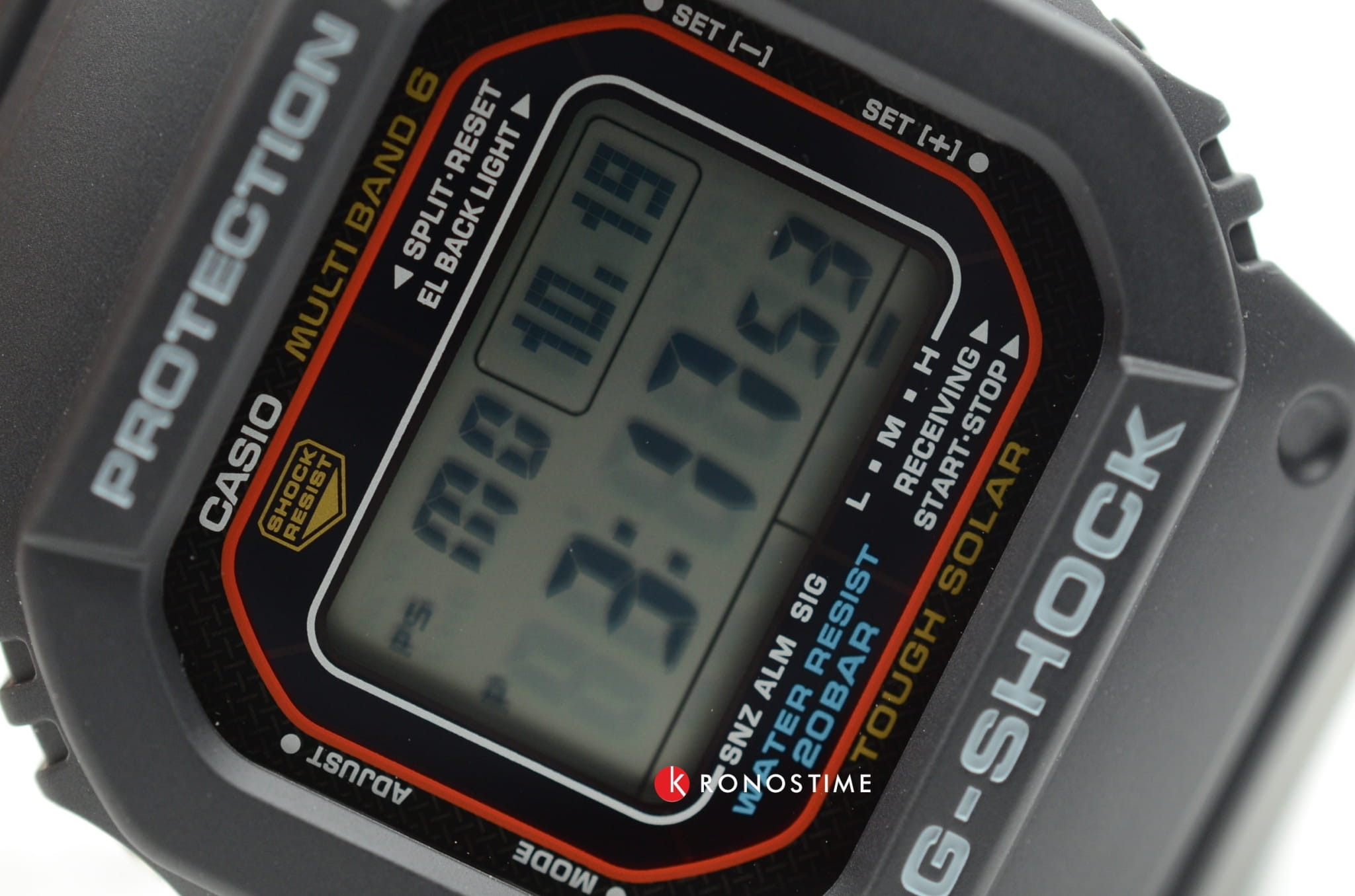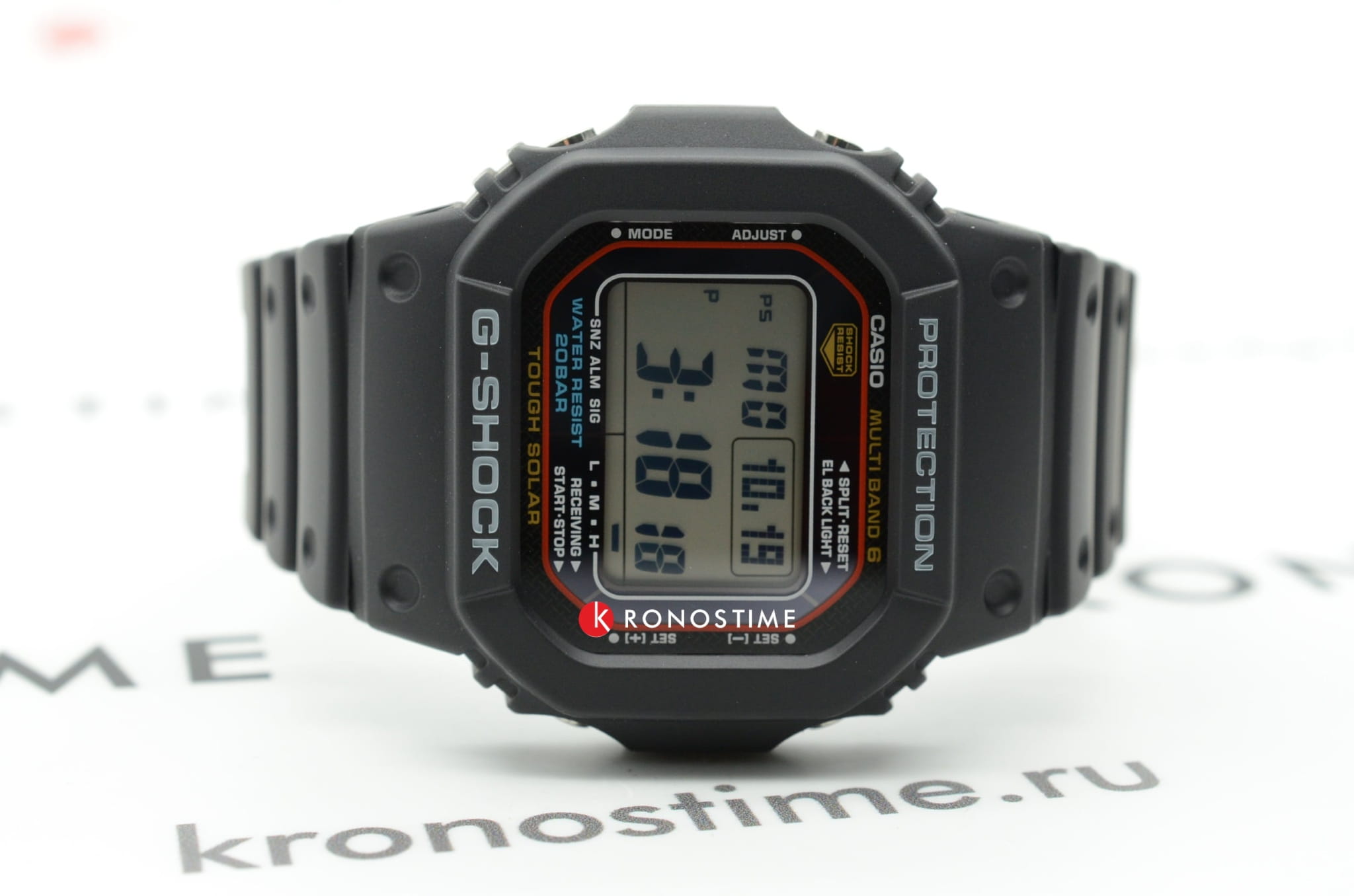 Вновь представлен тот самый 8-угольный противоударный корпусУдаропрочный корпусМеханизм заключён в корпус, выполненный из современных материалов, устойчивых к ударам, механическим повреждениям и падению с высоты: инновационный пластик, карбон, нержавеющая сталь, титан., ставший легендой. Часы выдерживают удары и падение с высоты, японский кварцевый механизм надёжно защищён от вибрации. Здесь реализуется технология питания от солнечного света , специальный индикатор позволяет следить за уровнем зарядки батареи. Минеральное стекло отличается устойчивостью к возникновению царапин. Электролюминесцентная подсветкаЭлектролюминесцентная подсветкаЭлектролюминесцентная панель устанавливается под ЖК-экраном часов, при нажатии кнопки электричество преобразуется в свет за счёт подачи напряжения на атомы фосфора, такой тип подсветки позволяет освещать весь циферблат. циферблата. Автоматическая корректировка времени по радиосигналу. Водонепроницаемость до 20 бар. Функции: хронографХронографФункция позволяет измерять отрезки времени с особой точностью: часы, минуты, секунды. Верным признаком хронографа является наличие на циферблате 3 дополнительных окошек-счётчиков., секундомер, таймер обратного отсчёта, мировое времяМировое время Полезное часовое усложнение, отображающее время в основных городах и известных областях по всему миру, оно связано с часовыми поясами, удобно для путешественников и бизнесменов. , 5 будильников, календарь. Габариты: 46,7 x 43,2 x 12,7 мм.