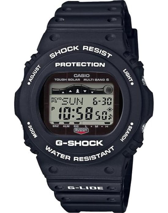 Компактная модель в олдскульном черном корпусе из профессиональной серии для серферов — G-SHOCK G-LIDE. Данная модель в белой расцветке позволяет отображать на дисплее графики приливов и фазы Луны, что позволяет получать информацию о текущих погодных условиях для серфинга, а радио-синхронизация времени позволит автоматически корректировать текущее время в любой точке мира.