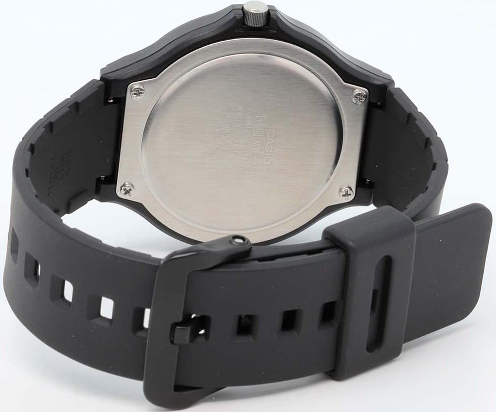 Японские мужские наручные часы Casio Collection MW-240-1E2VEF, кварцевый механизм с высокой точностью. Класс водозащиты: 50 метров, позволит защитить корпус от случайных брызг или капель дождя. Корпус часов изготовлен из пластика. Метки в виде штрихов. Заводная головка с защитой. Задняя крышка на 4-х винтах. Ремешок с классической застежкой. Батарея рассчитана на 3 года. Водонепроницаемость в соответствии с ISO 22810.