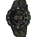 Часы, созданные для любителей активного отдыха. Противоударные мужские часы, выполненные в стиле миллитари. Кварцевые часы круглой формы с темно-зеленым цветом фона. Пластиковый корпус с минеральным стеклом удерживается пластиковым браслетом. Часы Casio PRG-300CM-3E оснащены секундомером, таймером обратного отсчета, барометром, высотомером, компасом. Источником энергии является солнечная батарея.
