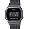 Японские мужские часы с хронографом Casio Vintage A168WEMB-1BDF (A168WEMB-1B), электронный механизм с высокой точностью. Класс водозащиты: 30 метров, позволит защитить корпус от случайных брызг или капель дождя. Корпус часов изготовлен из пластика, черного цвета.