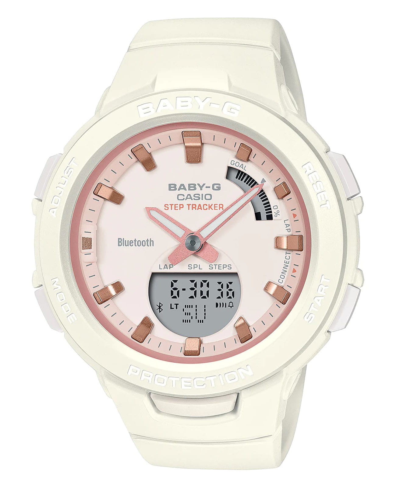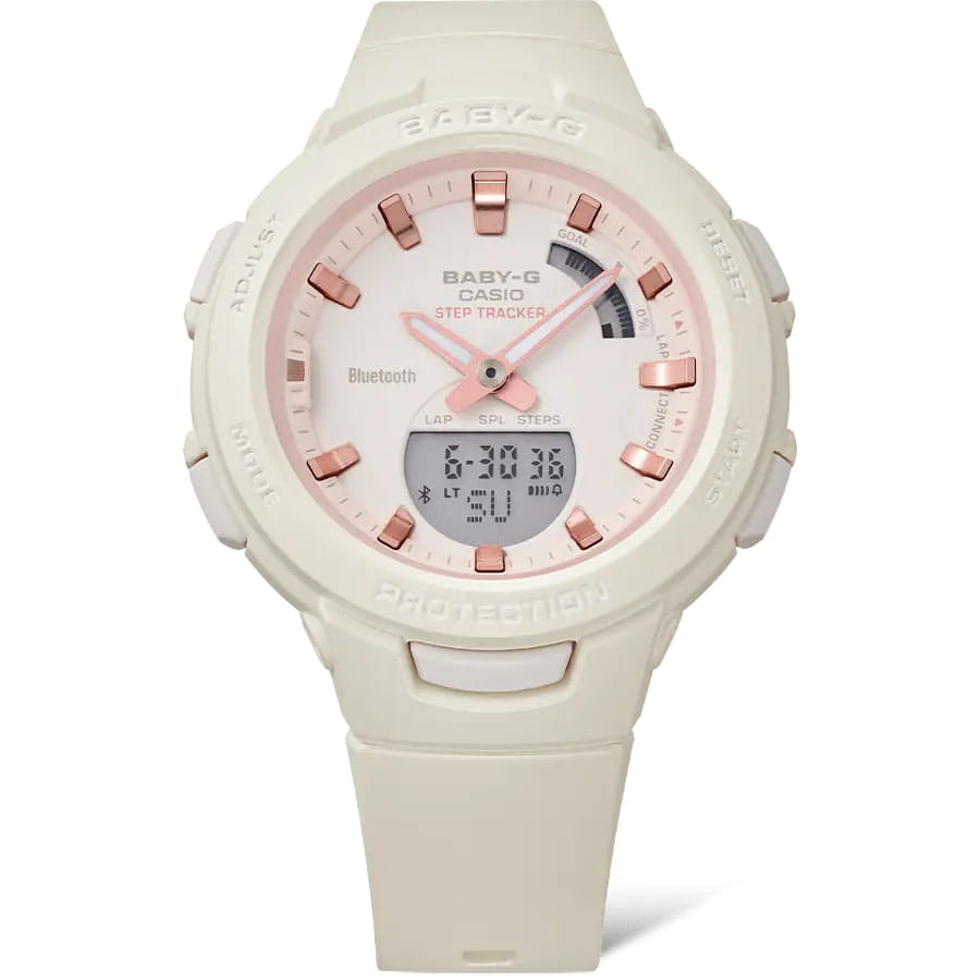 Женские японские часы Casio Baby-G BSA-B100CS-7A из спортивной коллекции Baby-G подойдут любительницам активности. Функциональная модель оснащена шагомером, позволяющим повысить эффективность занятий. Измеряется количество шагов от 0 до 999999, есть возможность установки ежедневной цели. Звуковой сигнал уведомляет об отсутствии активности. Технология Bluetooth 4.0BluetoothСовременная технология, позволяющая синхронизировать часы с телефоном и переносить данные. Часы с Bluetooth расширяют возможности вашего смартфона и делают его использование ещё более удобным. позволяет хранить информацию в приложении на смартфоне Baby-G Connected. Японский кварцевый механизм получает энергию от батарейки, рассчитанной на 2 года. Противоударный корпусУдаропрочный корпусМеханизм заключён в корпус, выполненный из современных материалов, устойчивых к ударам, механическим повреждениям и падению с высоты: инновационный пластик, карбон, нержавеющая сталь, титан. отражает силу удара, устойчив к падению, вибрации. Минеральное стекло. Светодиодная подсветкаСветодиодная подсветкаСветодиодная или LED-подсветка обеспечивает появление яркого холодного свечения за счёт LED-элементов - маленьких лампочек. Они потребляют минимальное количество энергии, чаще всего можно встретить 1 светодиод, в нижней части циферблата.. Водонепроницаемость 100 метров. Мировое времяМировое время Полезное часовое усложнение, отображающее время в основных городах и известных областях по всему миру, оно связано с часовыми поясами, удобно для путешественников и бизнесменов. - 300 городов, поиск телефона, таймер, будильник. Память на 200 результатов. Габариты: 49,6 x 41,4 x 12,6 мм.