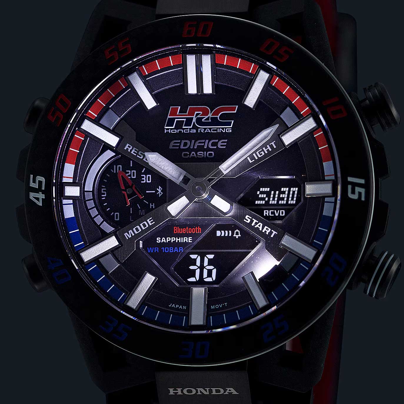Модель Casio Edifice ECB-2000HR-1A из коллекции Edifice сочетает передовые технологии и динамичный спортивный стиль. Корпус выполнен из углеродного волокнаCarbon Core Guard Новейшая структура корпуса, разработанная Casio. Полиуретановая пластина дополнительно усилена карбоновыми вставками, что придаёт специальную защиту от механических повреждений. Карбон отличается лёгкостью и прочностью., усиленного смолой, что обеспечивает прочность и легкость и стальной безельБезельВнешний ободок, закрепляющий стекло. В спортивных часах так называется поворотное кольцо с делениями на циферблате, выполняет роль таймера – замеряет отрезки времени на шкале. Неподвижный безель – элемент декора. Однонаправленно вращающийся безель на дайверских часах позволяет фиксировать моменты погружения и выныривания на поверхность. с PVD-покрытиемPVDУльтратонкое покрытие наносится в технике вакуумного напыления, сочетает в себе нитрид титана особой прочности со слоем золота или оксида хрома. Несёт в себе декоративную или защитную функцию.. Циферблат с металлическими метками и объемными элементами подчеркивает автоспортивный характер модели. Часы оснащены Bluetooth®-синхронизациейBluetoothСовременная технология, позволяющая синхронизировать часы с телефоном и переносить данные. Часы с Bluetooth расширяют возможности вашего смартфона и делают его использование ещё более удобным., позволяющей автоматически корректировать время, управлять мировым временемМировое время Полезное часовое усложнение, отображающее время в основных городах и известных областях по всему миру, оно связано с часовыми поясами, удобно для путешественников и бизнесменов. и передавать данные секундомера через приложение CASIO WATCHES. Солнечная батарея Tough SolarTough SolarТехнология основана на подзарядке аккумулятора от источника солнечного света, специальная панель улавливает солнечные лучи и преобразует их в энергию для работы часов. Достаточно пары минут нахождения на солнце для функционирования часов в течении суток. преобразует свет в энергию, обеспечивая бесперебойную работу. Дополнительные функции включают таймер обратного отсчетаТаймерОтсчитывает секунды в обратном направлении в заданном интервале времени. с индикатором на отметке 9 часов, будильникБудильникБуди́льник — часы, в заданный момент времени подающие звуковой, световой и/или в редких случаях другой сигнал., секундомерСекундомерСекундоме́р — прибор, способный измерять интервалы времени с точностью до долей секунды. и двойную светодиодную подсветку Super IlluminatorСветодиодная подсветкаСветодиодная или LED-подсветка обеспечивает появление яркого холодного свечения за счёт LED-элементов - маленьких лампочек. Они потребляют минимальное количество энергии, чаще всего можно встретить 1 светодиод, в нижней части циферблата. для удобного чтения показаний в темноте. Кожаный ремешок на стандартной застёжке. Водонепроницаемость до 100 метров делает модель подходящей для плавания и активного образа жизни. Edifice Sospensione x HRC Honda Racing. Модель отдает дань уважения захватывающим победам команды Honda Racing Corporation (HRC). Дизайн вдохновлен подвеской болида Формулы-1. Ушки часов разработаны по схеме четырехрычажной подвески гоночного автомобиля. Красные, синие и белые элементы, присутствующие в дизайне часов символизируют гордый гоночный дух. Значение каждого цвета 