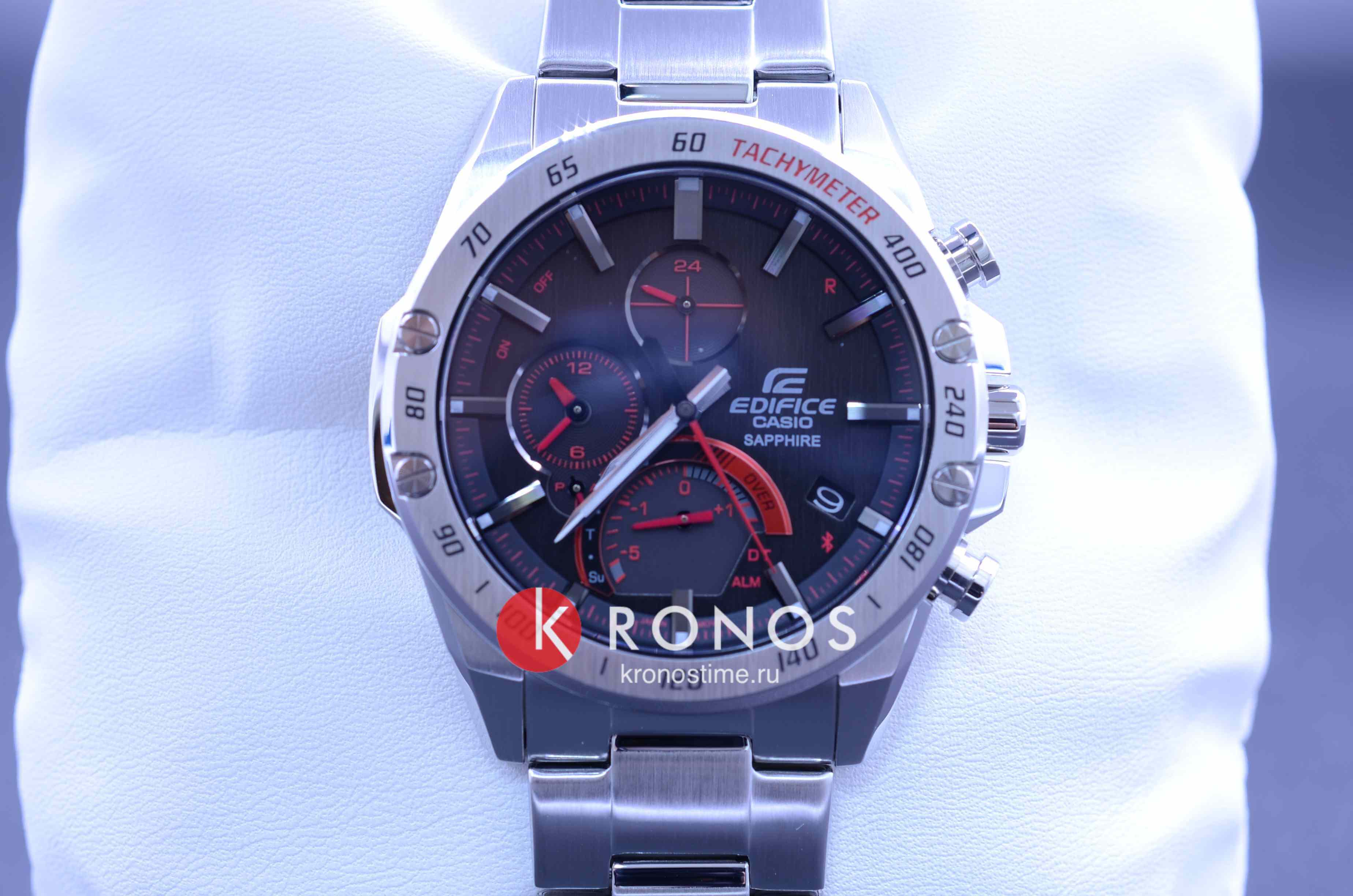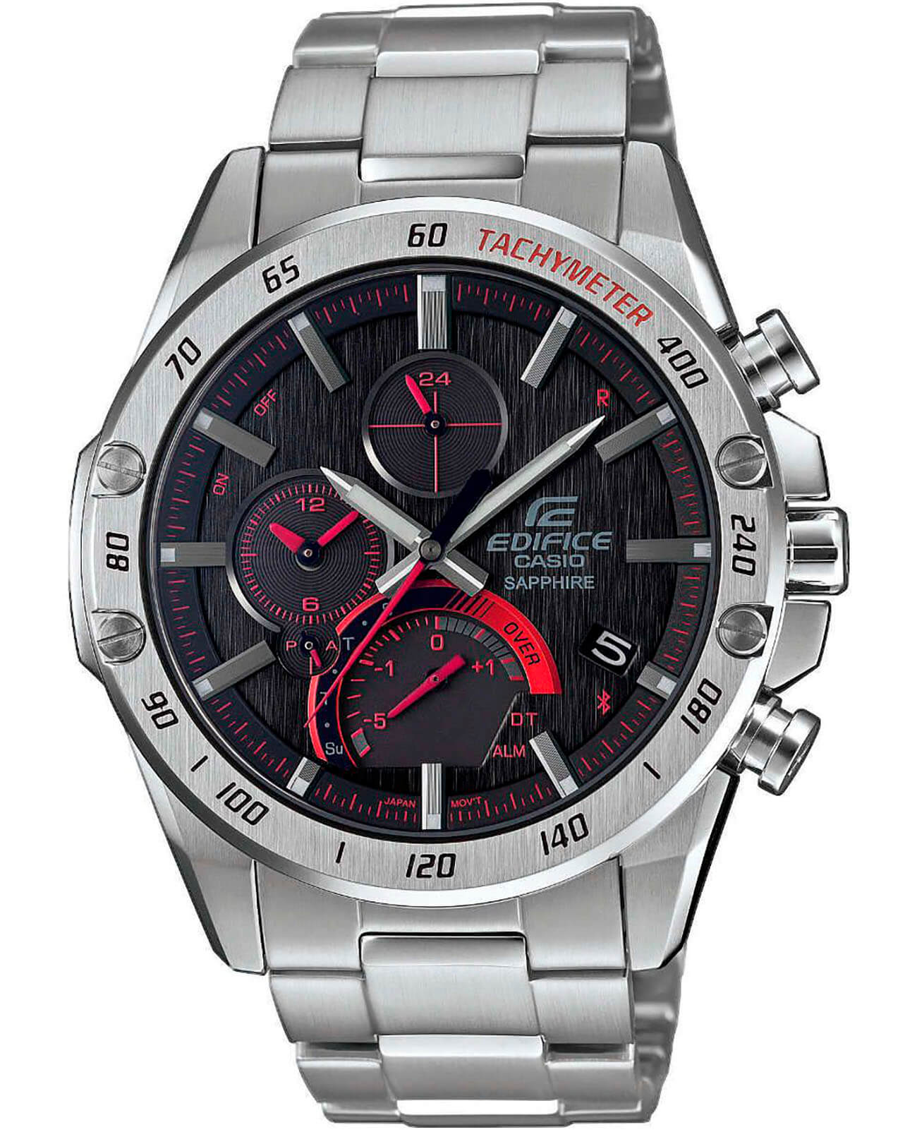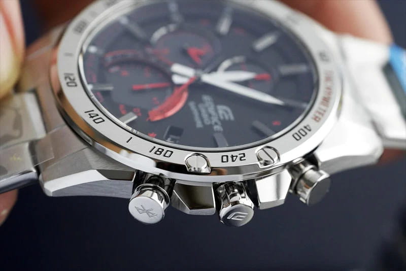 Стильная расцветка включает яркие красные акценты. Счётчик на позиции 6 часов имеет градиентную окантовку, что стало отсылкой к скорости и динамике. Аксессуар обладает ультратонким корпусом в 8,9 мм по сравнению с предшественниками серии EQB. Этого удалось добиться за счёт более плотного расположения деталей на модуле. Часы способны синхронизироваться со смартфоном для настроек точного времени и поиска телефона – технология BluetoothBluetoothСовременная технология, позволяющая синхронизировать часы с телефоном и переносить данные. Часы с Bluetooth расширяют возможности вашего смартфона и делают его использование ещё более удобным.. Питание японского кварцевого механизма обеспечивается за счёт солнечной батареи , следить за уровнем зарядки устройства можно благодаря специальному индикатору. Циферблат защищён сапфировым стеклом, устойчивым к появлению царапин. Стрелки имеют люминесцентное покрытиеЛюминесцентное покрытиеПозволяет считывать показания времени в темноте. Производители наносят на стрелки, часовые индексы, безель или поверхность циферблата светонакопительный состав, дающий холодное свечение.. Модель подходит для плавания, отличается водостойкостью до 10 бар и заводной головкой с защитой. Функции: хронографХронографФункция позволяет измерять отрезки времени с особой точностью: часы, минуты, секунды. Верным признаком хронографа является наличие на циферблате 3 дополнительных окошек-счётчиков., секундомер, тахиметрТахиметрРазмеченная шкала, располагается на ободке или безеле часов. Тахиметр позволяет рассчитать скорость на определённом участке пути, расстояние измеряется в километрах или милях., будильник, мировое времяМировое время Полезное часовое усложнение, отображающее время в основных городах и известных областях по всему миру, оно связано с часовыми поясами, удобно для путешественников и бизнесменов. , календарь. Есть индикатор последнего круга для любителей гонок. Габариты: 49,9 x 45,6 x 8,9 мм.