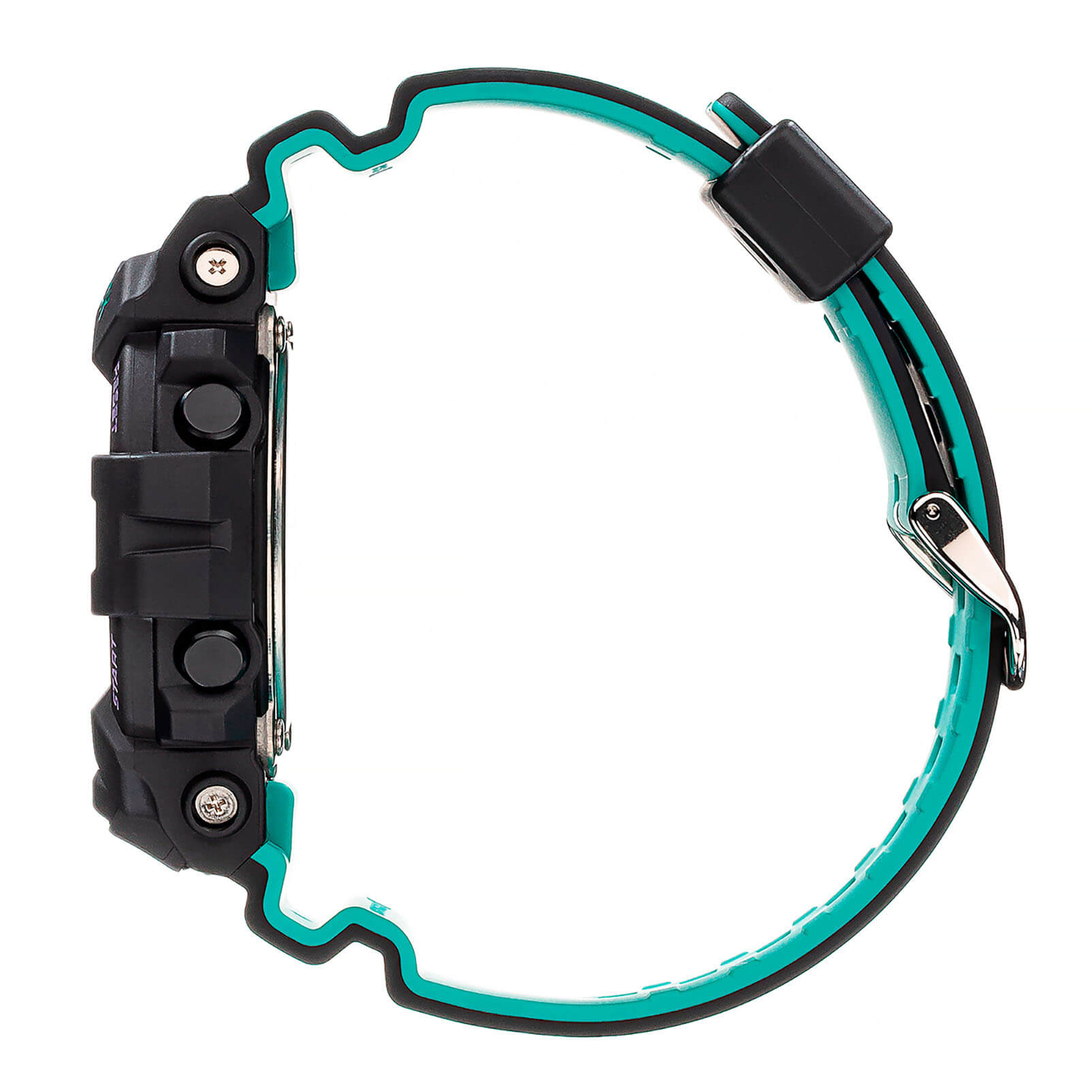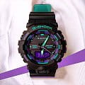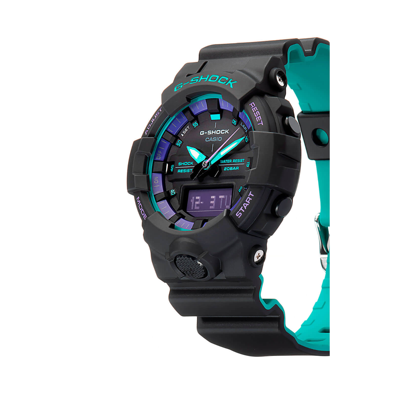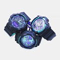 Основным цветом стал чёрный, на тёмном фоне отлично смотрятся фиолетовые и бирюзовые детали. При создании модели дизайнеры вдохновлялись атмосферой ночных клубов, где часто проводят время молодые люди. Аксессуар имеет уменьшенный противоударный корпусУдаропрочный корпусМеханизм заключён в корпус, выполненный из современных материалов, устойчивых к ударам, механическим повреждениям и падению с высоты: инновационный пластик, карбон, нержавеющая сталь, титан., если сравнивать с представителями серии GA-700, устойчивый к ударам и вибрации. Он надёжно защищает японский кварцевый механизм с точностью хода -/+ 15 секунд в месяц. Батарейка характеризуется 3-летним сроком службы. Прочное минеральное стекло. Автоматическая светодиодная подсветкаСветодиодная подсветкаСветодиодная или LED-подсветка обеспечивает появление яркого холодного свечения за счёт LED-элементов - маленьких лампочек. Они потребляют минимальное количество энергии, чаще всего можно встретить 1 светодиод, в нижней части циферблата., стрелки с люминесцентным покрытиемЛюминесцентное покрытиеПозволяет считывать показания времени в темноте. Производители наносят на стрелки, часовые индексы, безель или поверхность циферблата светонакопительный состав, дающий холодное свечение.. Минеральное стекло. Водозащита до 200 метров. Браслет из полимерного материала. Функция перемещения стрелок для лёгкого доступа к показаниям с цифровых мини-дисплеев. ХронографХронографФункция позволяет измерять отрезки времени с особой точностью: часы, минуты, секунды. Верным признаком хронографа является наличие на циферблате 3 дополнительных окошек-счётчиков., таймер обратного отсчёта, мировое времяМировое время Полезное часовое усложнение, отображающее время в основных городах и известных областях по всему миру, оно связано с часовыми поясами, удобно для путешественников и бизнесменов. , будильник, UTCUTCВсемирное кординационное время, не имеющее привязки к географическому положению Гринвича, основывается на атомном отсчёте времени. Регулировка времени осуществляется более точно, чем устаревшее GMT.