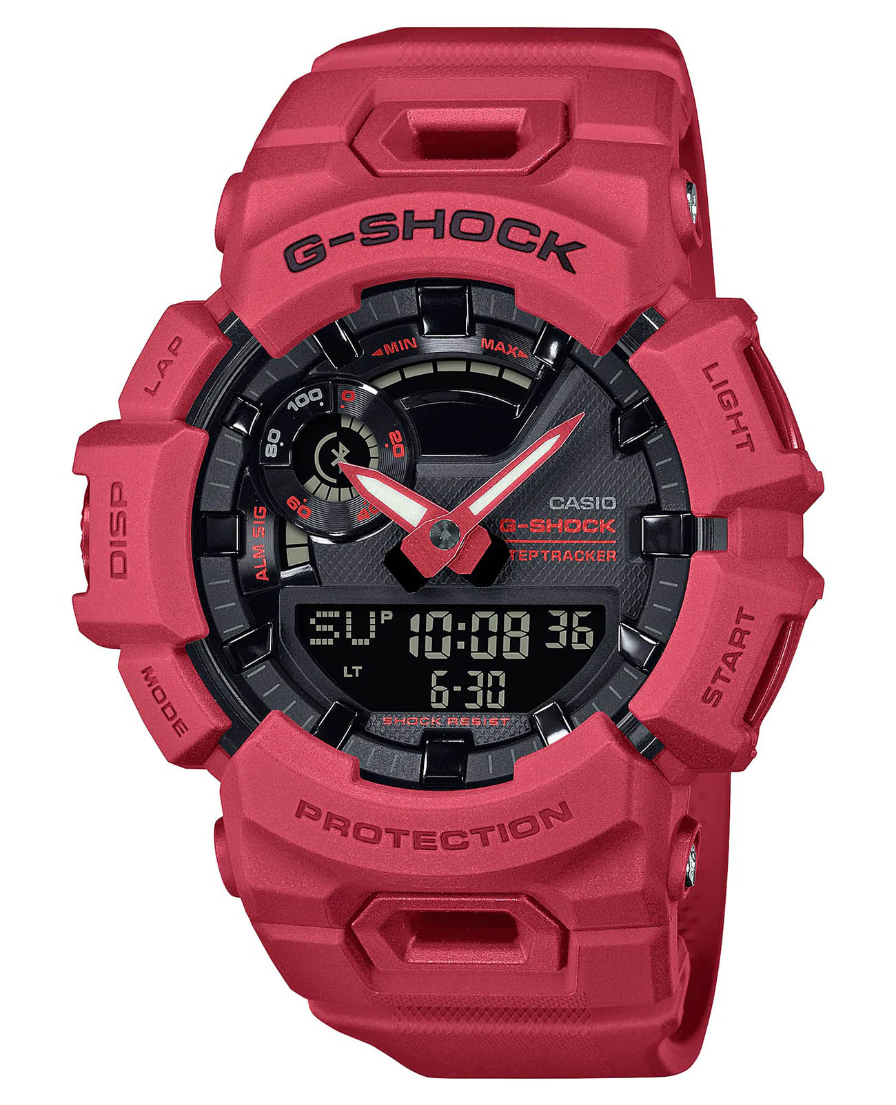 Японские мужские противоударные часы с шагомером Casio G-Shock GBA-900RD-4A, кварцевый механизм с высокой точностью. Класс водозащиты: 200 метров, позволит плавать, нырять и заниматься другими водными видами спорта. Корпус часов изготовлен из пластика красного цвета. Ударопрочный корпусУдаропрочный корпусМеханизм заключён в корпус, выполненный из современных материалов, устойчивых к ударам, механическим повреждениям и падению с высоты: инновационный пластик, карбон, нержавеющая сталь, титан. защищает механизм от ударов и вибрации. Модель обладает функцией шагомера и способна отслеживать дневную активность. Часы обладают многофункциональным таймером, который можно использовать для интервальных тренировок. с помощью технологии BluetoothBluetoothСовременная технология, позволяющая синхронизировать часы с телефоном и переносить данные. Часы с Bluetooth расширяют возможности вашего смартфона и делают его использование ещё более удобным.® часы способны синхронизироваться со смартфоном. БудильникБудильникБуди́льник — часы, в заданный момент времени подающие звуковой, световой и/или в редких случаях другой сигнал. и секундомерСекундомерСекундоме́р — прибор, способный измерять интервалы времени с точностью до долей секунды..