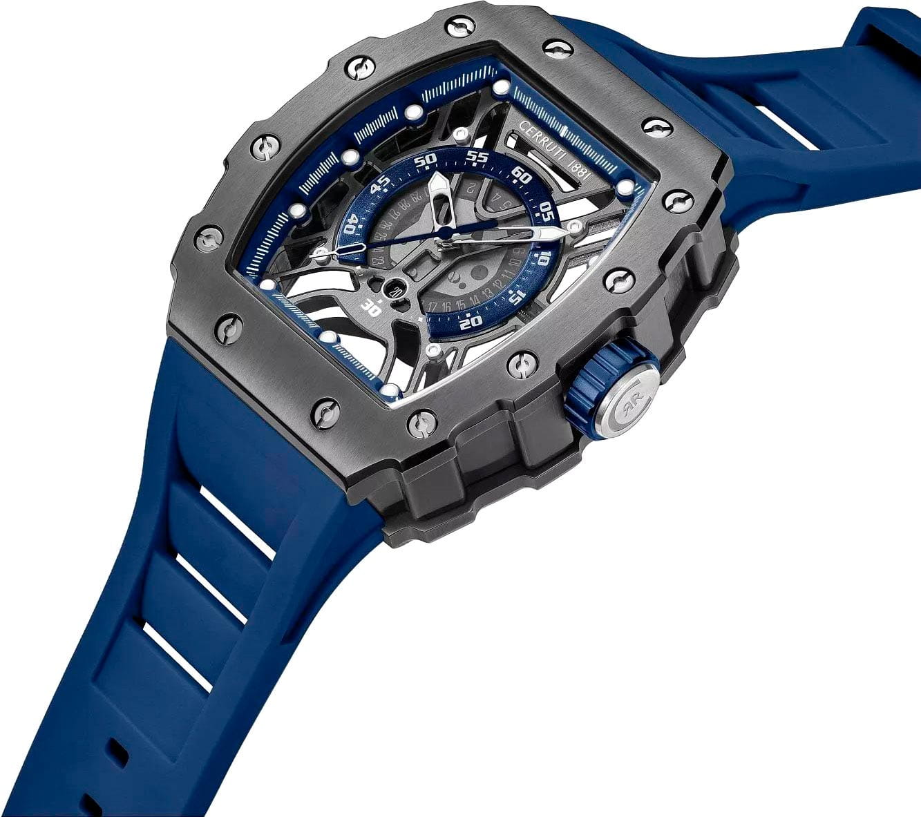 Cerruti 1881 CIWGN0057702 — эффектные мужские часы с дерзким современным дизайном, в которых сочетаются геометрическая точность линий и выразительная динамика формы. Корпус из нержавеющей стали с матовым PVD-покрытиемPVDУльтратонкое покрытие наносится в технике вакуумного напыления, сочетает в себе нитрид титана особой прочности со слоем золота или оксида хрома. Несёт в себе декоративную или защитную функцию. и мощным шестигранным безелемБезельВнешний ободок, закрепляющий стекло. В спортивных часах так называется поворотное кольцо с делениями на циферблате, выполняет роль таймера – замеряет отрезки времени на шкале. Неподвижный безель – элемент декора. Однонаправленно вращающийся безель на дайверских часах позволяет фиксировать моменты погружения и выныривания на поверхность. подчёркивает технический характер модели. Полупрозрачный скелетонизированный циферблат открывает детали механизма, придавая часам индустриальный и технологичный облик. Контрастные стрелки и метки с люминесцентным покрытиемЛюминесцентное покрытиеПозволяет считывать показания времени в темноте. Производители наносят на стрелки, часовые индексы, безель или поверхность циферблата светонакопительный состав, дающий холодное свечение. обеспечивают отличную читаемость, а прочное минеральное стеклоМинеральное стеклоМинеральное стекло представляет собой искусственно выращенный минерал кварца. Такое стекло отличается особой устойчивостью к повреждениям и царапинам. Уступает по некоторым качествам сапфировому стеклу. защищает композицию от внешних воздействий. Эластичный силиконовый ремешок насыщенного синего цвета гармонично сочетается с оттенками корпуса и обеспечивает комфорт при ежедневном ношении. Cerruti 1881 — это смелое воплощение итальянского стиля в спортивно-индустриальной эстетике, созданное для мужчин, уверенно идущих в ногу с временем.