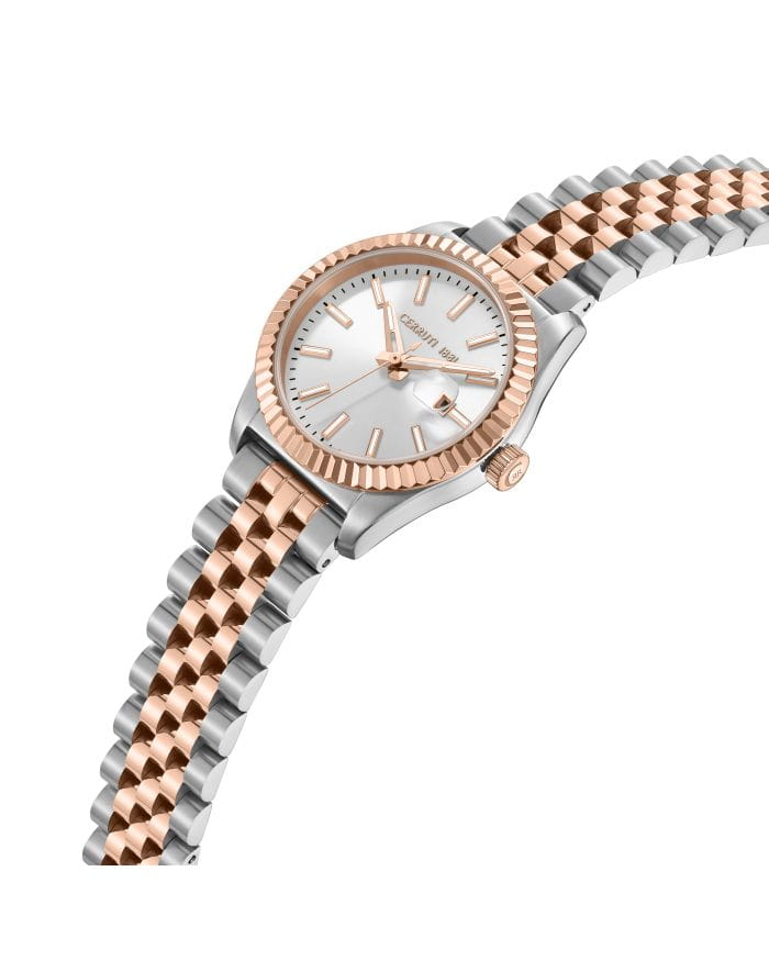 Женские кварцевые часы Cerruti 1881 Chienti CIWLH0084202 — изысканный французский аксессуар с золотистыми акцентами и функцией даты. Корпус из нержавеющей стали 316L. БезельБезельВнешний ободок, закрепляющий стекло. В спортивных часах так называется поворотное кольцо с делениями на циферблате, выполняет роль таймера – замеряет отрезки времени на шкале. Неподвижный безель – элемент декора. Однонаправленно вращающийся безель на дайверских часах позволяет фиксировать моменты погружения и выныривания на поверхность. с частичным PVD-покрытиемPVDУльтратонкое покрытие наносится в технике вакуумного напыления, сочетает в себе нитрид титана особой прочности со слоем золота или оксида хрома. Несёт в себе декоративную или защитную функцию. золотистого цвета, размером 31 мм. Циферблат — серебристый с штриховыми метками. Окошко даты в положении 3 часов. Стекло — минеральноеМинеральное стеклоМинеральное стекло представляет собой искусственно выращенный минерал кварца. Такое стекло отличается особой устойчивостью к повреждениям и царапинам. Уступает по некоторым качествам сапфировому стеклу. с сапфировым покрытием. Стрелки и метки с люминесцентным покрытиемЛюминесцентное покрытиеПозволяет считывать показания времени в темноте. Производители наносят на стрелки, часовые индексы, безель или поверхность циферблата светонакопительный состав, дающий холодное свечение.. Браслет — стальной с частичным PVD-покрытиемPVDУльтратонкое покрытие наносится в технике вакуумного напыления, сочетает в себе нитрид титана особой прочности со слоем золота или оксида хрома. Несёт в себе декоративную или защитную функцию. на застёжке «бабочка» с кнопкамиЗастёжка "бабочка"Такой вид застёжки дополняется предохранителями, помогающими избежать случайного раскрытия браслета. Обладают изящным исполнением. . Водонепроницаемость 50 м. Идеальный выбор для тех, кто ценит французский дизайн и повседневную элегантность.