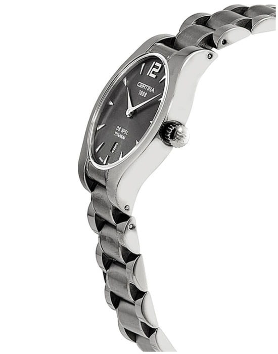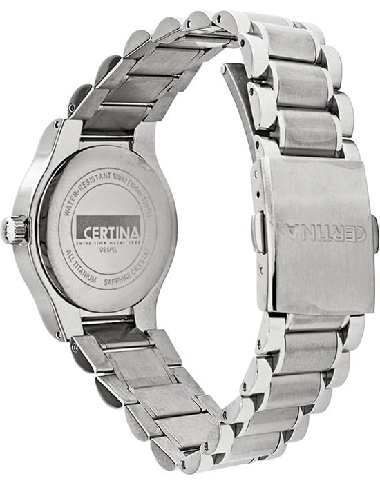 С виду женственная модель внутри – крепкий орешек. Корпус с концепцией DSDS ConceptDouble Security Concept, обозначает двойную надёжность и безупречную точность часов Certina. Двойная система защиты подразумевает обеспечение максимальной устойчивости к ударам и высоких показателей водонепроницаемости. выполнен из прочного гипоаллергенного титана. Антрацитовый циферблат защищён сапфировым стеклом, устойчивым к царапинам. Водозащита WR 100. Отображение числа.