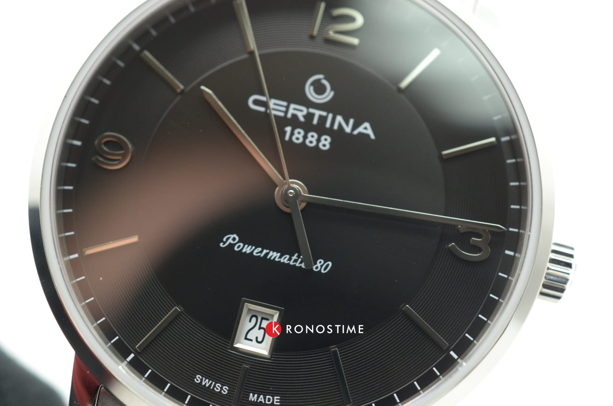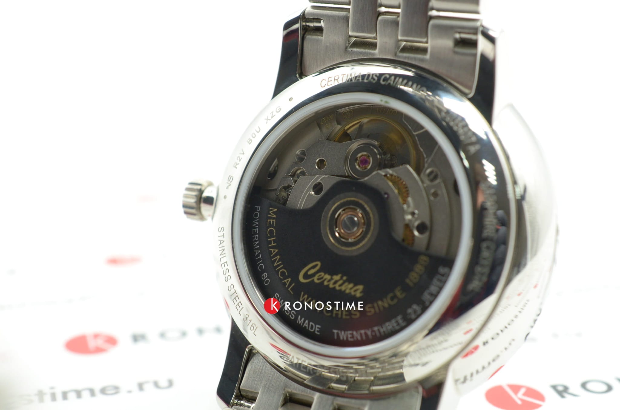 Чёрный минималистичный циферблат выдержан в строгом и сдержанном стиле. Привлекательно смотрится стальной браслет с рядами звеньев различного размера. Часы с автоматической системой завода оснащены пружинным калибром ETA Powermatic 80Powermatic 80Эксклюзивный калибр от швейцарской компании ETA с увеличенным запасом хода до 80 часов за счёт удлинённой заводной пружины. Характеризуется улучшенной системой спуска со сниженным трением., имеющим с 80-часовой запас хода. Прозрачная задняя крышка. Надёжный корпус из антикоррозионной стали 316L. Концепция DS ConceptDS ConceptDouble Security Concept, обозначает двойную надёжность и безупречную точность часов Certina. Двойная система защиты подразумевает обеспечение максимальной устойчивости к ударам и высоких показателей водонепроницаемости.. Сапфировое стекло. Водонепроницаемость 10 бар. . Апертура даты. Диаметр корпуса: 39 мм.