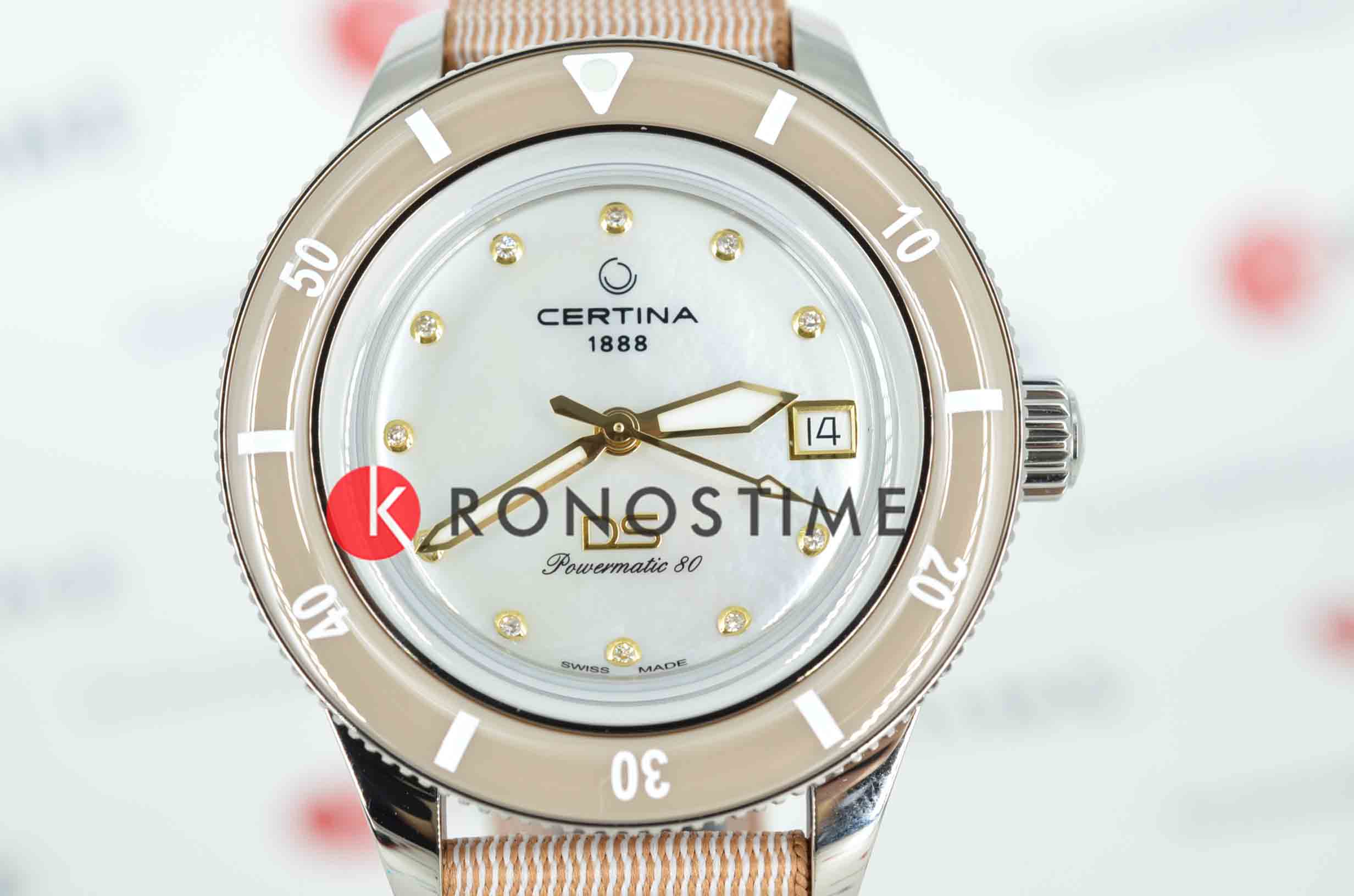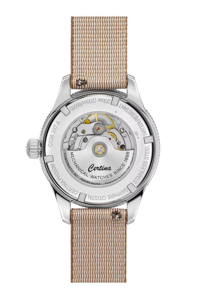 Модель Certina C036.207.18.116.00 из коллекции DS PH200M сочетает в себе элегантный дизайн и высокие технические характеристики. Корпус диаметром 39 мм выполнен из нержавеющей стали 316L, обеспечивая прочность и устойчивость к коррозии. Циферблат из белого перламутра украшен одиннадцатью бриллиантами и дополнен стрелками и индексами с покрытием из розового золота, покрытыми люминесцентным покрытиемЛюминесцентное покрытиеПозволяет считывать показания времени в темноте. Производители наносят на стрелки, часовые индексы, безель или поверхность циферблата светонакопительный состав, дающий холодное свечение. для отличной читаемости в темноте.