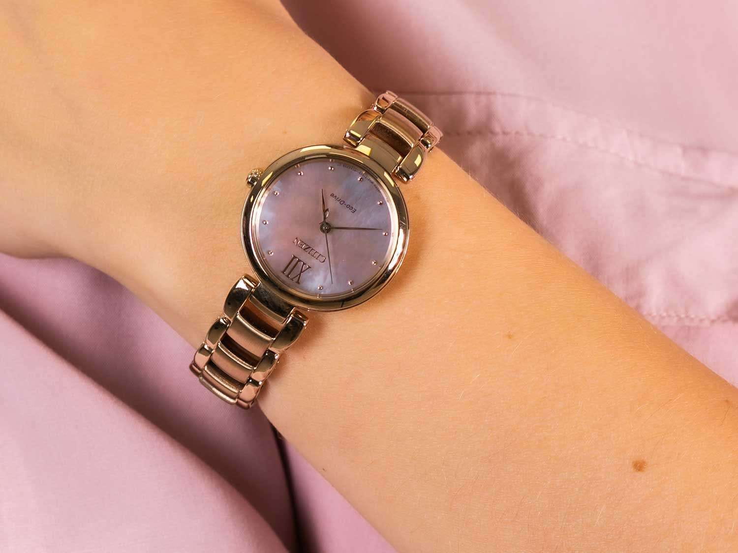 Часы Citizen EM0533-82Y — гармоничное сочетание строгого дизайна и современных технологий японского производства. Корпус и браслет выполнены из прочной нержавеющей стали с золотистым IP-покрытиемIP-покрытиеМетод ионного напыления. Демонстрирует повышенную устойчивость к истиранию, окислению и химическим веществам. Под воздействием высокого давления и температуры около 1500°C молекулы металла надёжно соединяются с частицами корпуса часов., что обеспечивает надёжность и элегантный внешний вид. Перламутровый розовый циферблат с часовыми метками в виде точек и римской цифрой 12 защищён устойчивым к царапинам сапфировым стекломСапфировое стеклоПрочный и надёжный материал из кристалла сапфира синтетического происхождения, характеризующийся особой твёрдостью и устойчивостью к царапинам и повреждениям., сохраняя безупречную прозрачность на протяжении долгого времени. Модель оснащена инновационной системой Eco-Drive, работающей на солнечной энергии и не требующей замены батарейки, с запасом хода до 180 дней. Практичные функции включают индикацию уровня заряда (EOLEOLПредставляет собой систему, уведомляющую владельца часов о необходимости замены элемента питания. За 2 недели до полного разряда батарейки секундная стрелка перестаёт ходить чётко и начинает перепрыгивать на 3-4 деления.) и защиту от перезарядки. Диаметр корпуса составляет 28,7 мм, толщина — 7,8 мм, вес — 63 г, что обеспечивает удобную посадку на запястье. Водозащита уровня 50WR позволяет не снимать часы при мытье рук или во время дождя. Браслет с застежкой «бабочка»Застёжка "бабочка"Такой вид застёжки дополняется предохранителями, помогающими избежать случайного раскрытия браслета. Обладают изящным исполнением. обеспечивает дополнительный комфорт и безопасность при носке. Эта модель станет надёжным аксессуаром, подчёркивающим индивидуальный стиль и уверенность в любой ситуации.