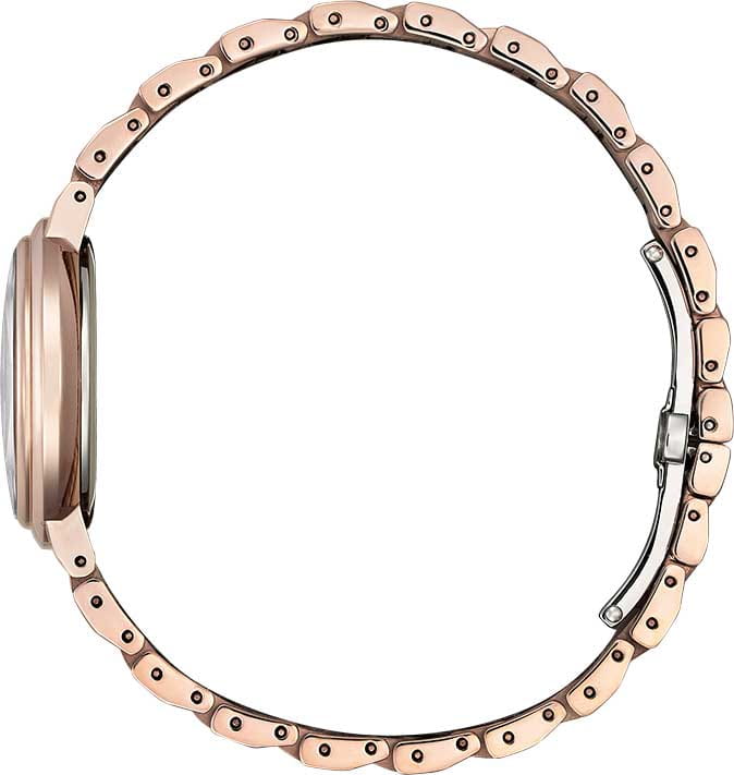 Часы Citizen EM0912-84Y — воплощение изысканности и современных технологий, выполненное в Японии. Корпус и литой браслет изготовлены из прочной нержавеющей стали с золотистым IP-покрытиемIP-покрытиеМетод ионного напыления. Демонстрирует повышенную устойчивость к истиранию, окислению и химическим веществам. Под воздействием высокого давления и температуры около 1500°C молекулы металла надёжно соединяются с частицами корпуса часов., что гарантирует долговечность и элегантный внешний вид. Перламутровый розовый циферблат с завораживающими переливами украшен бриллиантом, а часовые метки выполнены в виде точек, что придаёт образу особую утонченность. Заводная головка с защитой находится в положении 8 часов и также украшена камнем. Защиту от царапин обеспечивает сапфировое стеклоСапфировое стеклоПрочный и надёжный материал из кристалла сапфира синтетического происхождения, характеризующийся особой твёрдостью и устойчивостью к царапинам и повреждениям., сохраняющее безупречный вид часов на длительное время. Модель оснащена инновационной системой Eco-Drive, работающей на солнечной энергии и не требующей замены батарейки, с запасом хода до 180 дней. Предусмотрена функция индикации уровня заряда (EOLEOLПредставляет собой систему, уведомляющую владельца часов о необходимости замены элемента питания. За 2 недели до полного разряда батарейки секундная стрелка перестаёт ходить чётко и начинает перепрыгивать на 3-4 деления.) и предотвращения перезарядки. Диаметр корпуса составляет 30 мм, толщина — 8,5 мм, вес — 74 г, что обеспечивает комфортное ношение в течение всего дня. Водозащита уровня 50WR позволяет не снимать часы при мытье рук или в дождливую погоду. Браслет с застежкой «бабочка»Застёжка "бабочка"Такой вид застёжки дополняется предохранителями, помогающими избежать случайного раскрытия браслета. Обладают изящным исполнением. обеспечивает дополнительный комфорт и безопасность при носке. Эта модель станет не только стильным аксессуаром, но и символом безупречного вкуса и внимания к деталям.