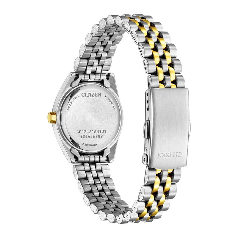 Элегантные часы Citizen EU6066-59A сочетают в себе изысканный дизайн и надежность японского качества. Круглый корпус диаметром 26 мм изготовлен из нержавеющей стали и украшен сверкающими кристаллами по безелюБезельВнешний ободок, закрепляющий стекло. В спортивных часах так называется поворотное кольцо с делениями на циферблате, выполняет роль таймера – замеряет отрезки времени на шкале. Неподвижный безель – элемент декора. Однонаправленно вращающийся безель на дайверских часах позволяет фиксировать моменты погружения и выныривания на поверхность. с PVD-покрытиемPVDУльтратонкое покрытие наносится в технике вакуумного напыления, сочетает в себе нитрид титана особой прочности со слоем золота или оксида хрома. Несёт в себе декоративную или защитную функцию. цвета желтого золота, что придает модели утонченный вид. Серебристый циферблат дополнен центральными стрелками и апертурой даты на позиции 3 часов. Минеральное стеклоМинеральное стеклоМинеральное стекло представляет собой искусственно выращенный минерал кварца. Такое стекло отличается особой устойчивостью к повреждениям и царапинам. Уступает по некоторым качествам сапфировому стеклу. защищает от мелких повреждений, а стальной браслет с частичным PVD-покрытиемPVDУльтратонкое покрытие наносится в технике вакуумного напыления, сочетает в себе нитрид титана особой прочности со слоем золота или оксида хрома. Несёт в себе декоративную или защитную функцию. цвета желтого золота и с раскладной застёжкойРаскладная застёжкаТакой тип застёжки используется только на браслетах из металла. Она никогда не раскрывается полностью, происходит разделение на 2 и более частей. Раскладывающая застёжка снизит вероятность потери часов к минимуму. обеспечивает комфортную посадку. Стрелки с люминесцентным покрытиемЛюминесцентное покрытиеПозволяет считывать показания времени в темноте. Производители наносят на стрелки, часовые индексы, безель или поверхность циферблата светонакопительный состав, дающий холодное свечение. для отличной читаемости в любое время суток. Благодаря водостойкости WR 50 часы подходят для повседневного ношения, включая мытье рук и дождь.