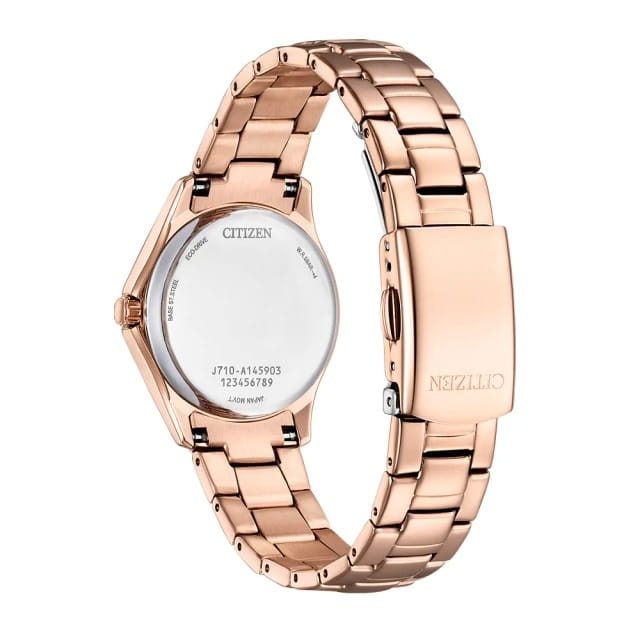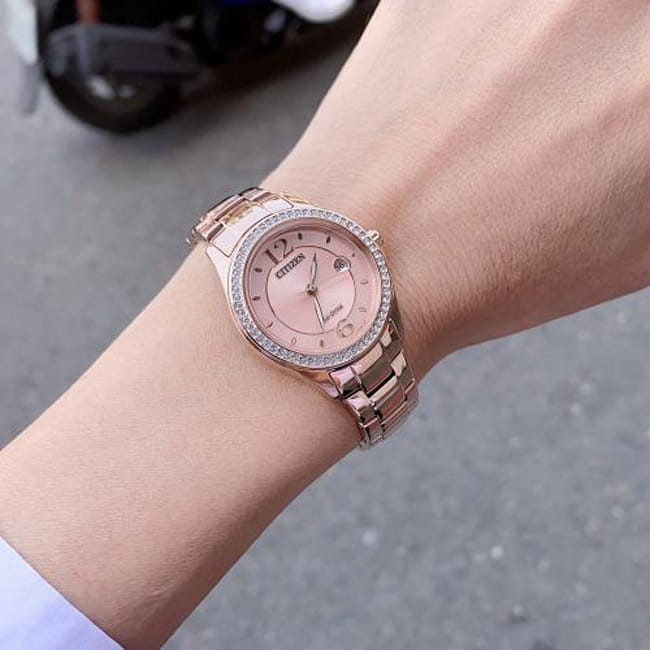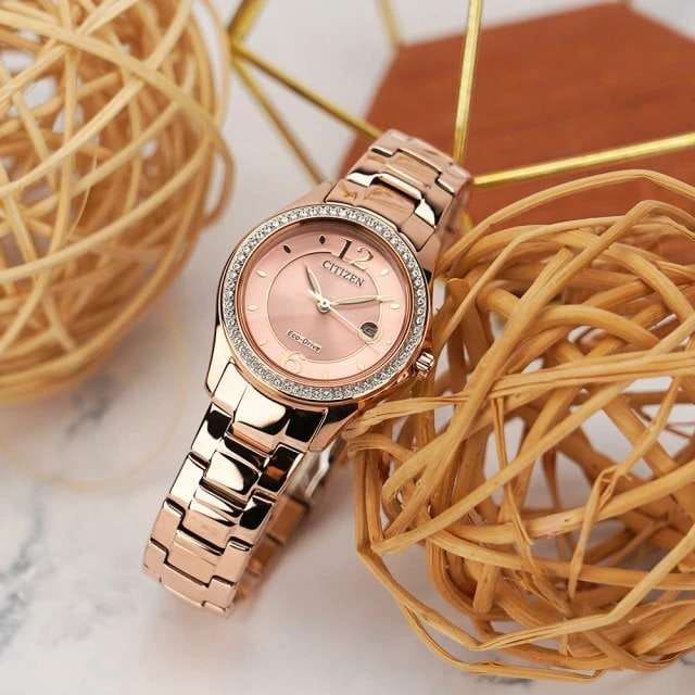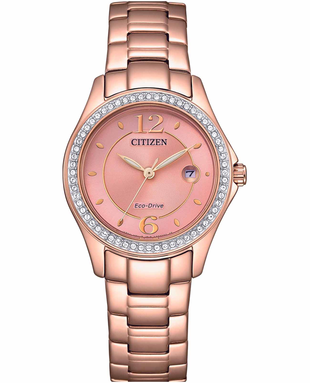 Изящные женские часы Citizen FE1252-82X сочетают в себе современную японскую точность и утончённый стиль. Кварцевый механизм обеспечивает надёжную работу и минимальное отклонение времени. Корпус диаметром 29,5 мм и толщиной 8,5 мм выполнен из нержавеющей стали с изысканным  IP-покрытиемIP-покрытиеМетод ионного напыления. Демонстрирует повышенную устойчивость к истиранию, окислению и химическим веществам. Под воздействием высокого давления и температуры около 1500°C молекулы металла надёжно соединяются с частицами корпуса часов. розового золота, что придаёт изделию особый шарм. А безельБезельВнешний ободок, закрепляющий стекло. В спортивных часах так называется поворотное кольцо с делениями на циферблате, выполняет роль таймера – замеряет отрезки времени на шкале. Неподвижный безель – элемент декора. Однонаправленно вращающийся безель на дайверских часах позволяет фиксировать моменты погружения и выныривания на поверхность. часов покрыт кристаллами, что придаёт аксессуару изящный и утончённый вид. Розовый циферблат украшен 60 сверкающими кристаллами, создавая эффектное мерцание при каждом движении. Центральные стрелки отображают часы, минуты и секунды, а окошко даты расположено на отметке «3 часа» для удобства отслеживания текущей даты. Стрелки с люминесцентным покрытиемЛюминесцентное покрытиеПозволяет считывать показания времени в темноте. Производители наносят на стрелки, часовые индексы, безель или поверхность циферблата светонакопительный состав, дающий холодное свечение. обеспечивают отличную читаемость времени даже в темное время суток. Часы оснащены прочным минеральным стекломМинеральное стеклоМинеральное стекло представляет собой искусственно выращенный минерал кварца. Такое стекло отличается особой устойчивостью к повреждениям и царапинам. Уступает по некоторым качествам сапфировому стеклу., защищающим от случайных царапин, и водозащитой уровня WR50, что позволяет не беспокоиться о брызгах и дожде. Стальной браслет с раскладной застёжкойРаскладная застёжкаТакой тип застёжки используется только на браслетах из металла. Она никогда не раскрывается полностью, происходит разделение на 2 и более частей. Раскладывающая застёжка снизит вероятность потери часов к минимуму. на кнопке обеспечивает надёжную фиксацию и комфортную посадку на запястье.