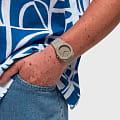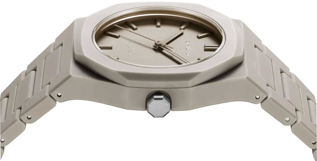 Часы D1 Milano Polycarbon PCBU06– молодежные часы в стиле унисекс для повседневных образов, стильные и комфортные.  Модель Ecru имеет бежевый корпус и браслет из поликарбоната с покрытием Софт-Тач. Циферблат лаконичный с индексами в виде штрихов, защищен минеральным стекломМинеральное стеклоМинеральное стекло представляет собой искусственно выращенный минерал кварца. Такое стекло отличается особой устойчивостью к повреждениям и царапинам. Уступает по некоторым качествам сапфировому стеклу. с антибликовым покрытием. Стальная задняя крышка на 4 винтах.  Пластиковый браслет на застёжке «бабочка» с кнопкамиЗастёжка "бабочка"Такой вид застёжки дополняется предохранителями, помогающими избежать случайного раскрытия браслета. Обладают изящным исполнением. .