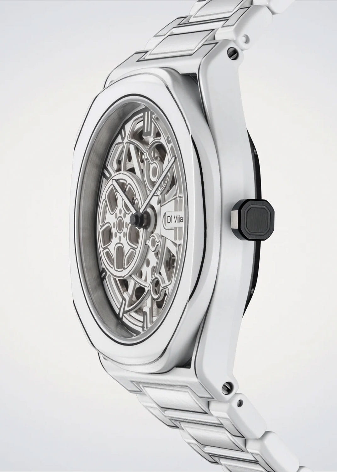 Часы D1 Milano Skeleton SKBJ20 — это эффектные механические мужские часы, разработанные для ценителей уникальных аксессуаров. Их утонченный дизайн и высокое качество исполнения делают эти часы незаменимым элементом вашего стиля. Изготовленные в Италии, они оснащены надежным механизмом Seiko TMI NH70L с автоподзаводом, обеспечивающими запас хода до 41 часа. Частота работы механизма составляет 21600 полуколебаний в час. Часы имеют корпус из нержавеющей стали с керамическим покрытием Cerakote, что гарантирует долговечность и стойкость к внешним воздействиям. Скелетонизированный циферблат защищен сапфировым стекломСапфировое стеклоПрочный и надёжный материал из кристалла сапфира синтетического происхождения, характеризующийся особой твёрдостью и устойчивостью к царапинам и повреждениям. с антибликовым покрытиемАнтибликовое покрытиеСлой оксида металла в 0,13-0,3 микрон, благодаря которому стекло часов не бликует и не отражает свет. Антибликовое покрытие уменьшает отражение света в 10 раз, обеспечивая отличную читаемость показателей циферблата., подчеркивающим элегантность и изысканность модели и защищает от царапин. Метки в виде штрихов и прозрачная задняя крышка, закрепленная на 8 винтах, придают часам особый шарм. Стальной браслет на застёжке-бабочке с кнопкамиЗастёжка "бабочка"Такой вид застёжки дополняется предохранителями, помогающими избежать случайного раскрытия браслета. Обладают изящным исполнением. обеспечивает комфортное и надежное ношение. Водозащита до 50 WR делает эти часы подходящими для повседневного использования.