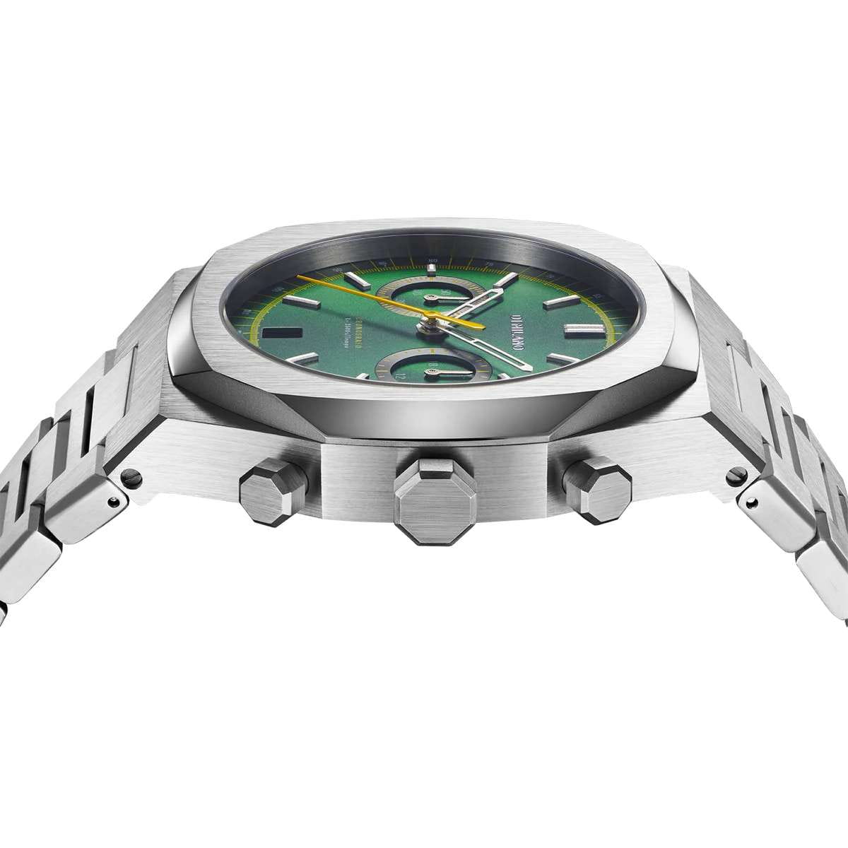 Элегантный хронограф D1 Milano Cronografo CHBJ10 Noble Green - идеальное воплощение мужественности и стиля. Этот многофункциональный аксессуар оснащен секундомером,тахиметромТахиметрРазмеченная шкала, располагается на ободке или безеле часов. Тахиметр позволяет рассчитать скорость на определённом участке пути, расстояние измеряется в километрах или милях. и двойным форматом времени, что делает его незаменимым компаньоном в повседневной жизни. Минималистичный дизайн циферблата с штриховыми метками, защищенный прочным сапфировым стекломСапфировое стеклоПрочный и надёжный материал из кристалла сапфира синтетического происхождения, характеризующийся особой твёрдостью и устойчивостью к царапинам и повреждениям., привлекает внимание своей сдержанной красотой. Надежная конструкция с задней крышкой на 8 винтах и стильный браслет с удобной застежкой обеспечивают комфорт при ношении. Каждый экземпляр уникален благодаря индивидуальному серийному номеру. Noble Green - это не просто часы, а статусный аксессуар, подчеркивающий безупречный вкус и внимание к деталям своего владельца.