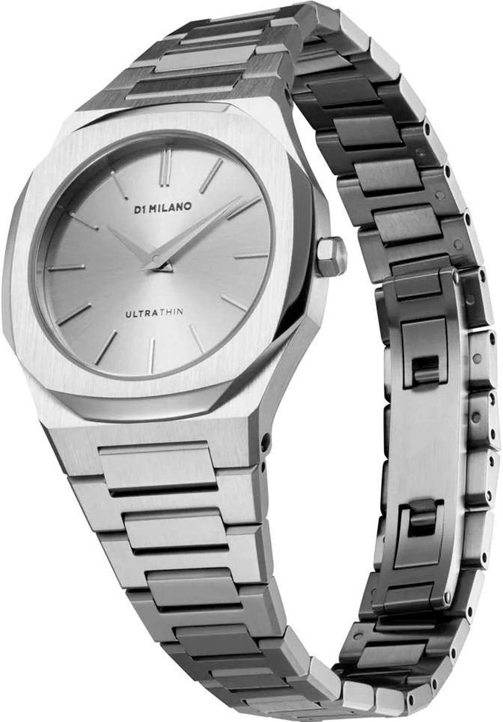 Наручные часы D1 Milano UTBL30 из коллекции Ultra Thin сочетают в себе элегантный дизайн и современные технологии. Модель обладает круглым корпусом диаметром 30 мм, изготовленным из нержавеющей стали с вертикальной шлифовкой, что обеспечивает высокую устойчивость к внешним воздействиям. Для защиты циферблата используется сапфировое стеклоСапфировое стеклоПрочный и надёжный материал из кристалла сапфира синтетического происхождения, характеризующийся особой твёрдостью и устойчивостью к царапинам и повреждениям. с антибликовым покрытиемАнтибликовое покрытиеСлой оксида металла в 0,13-0,3 микрон, благодаря которому стекло часов не бликует и не отражает свет. Антибликовое покрытие уменьшает отражение света в 10 раз, обеспечивая отличную читаемость показателей циферблата., которое эффективно противостоит царапинам и механическим повреждениям. Часы оснащены кварцевым механизмом Miyota 1L22, гарантирующим точное время без необходимости подзаводки. Водонепроницаемость модели достигает 5 атмосфер (50 метров), что позволяет использовать их при контакте с водой, например, во время мытья рук или дождя. Браслет выполнен из нержавеющей стали с раскладной застежкой с кнопкойРаскладной замокДанный вариант застежки используется только на часах с металлическим браслетом. Отличительная особенность такого крепления в том, что длина браслета становится универсальной и вы можете самостоятельно отрегулировать нужный вам размер – застежка просто двигается по браслету часов., обеспечивающей комфортное ношение и безопасность. Циферблат серебристого цвета с узором Sunray (Soleil) придает часам особую изысканность и делает их идеальным выбором для повседневного использования или особых случаев.